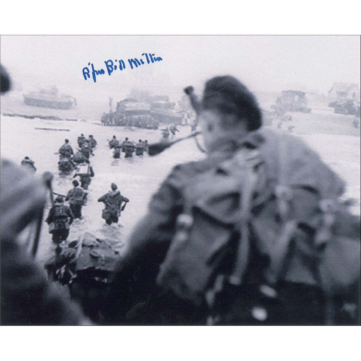 William “Bill” Millin (1922–2010) served as the Piper of the 1st Special Service Commando Brigade. As he landed on the Normandy Beaches, he upheld his role, playing the Brigade shore with his bagpipes under attack from enemy fire, and continued to provide the hymns to his comrades throughout the fight. Fantastic satin-finish 10 x 8 photo of Millin and the troops as they landed at Sword Beach in Normandy, signed in blue felt tip, “Piper Bill Millin.” In fine condition.