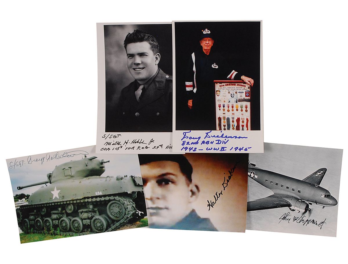 Five glossy photos, two color, 4 x 6 and 6 x 4, each signed in felt tip or ballpoint by a participant in the D-Day invasion. Signers are: George Goldstein, John Clippard, Douglas Dickerson, Mills Hobbs, and Walter Dickens. In overall fine condition.