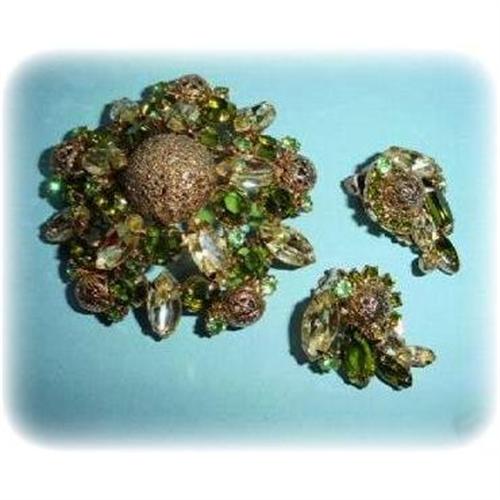 Magnificent in color, superb manufacturing and quality materials, what else could it be....DeLizza & Elster we're surmising! It carries all of the attributes associated with this coming of age company also known as D&E and generally referred to as "Juliana". Originally sold with hang tags only, we believe this piece to be from the magnificent 50's era. <BR><BR>Brooch Demi is beautifully designed with brilliant facet cut and prong set Citrine navettes, Olivine round cut and small dogtoothed mounted Peridot colored chatons. Delicate highly detailed Filigree balls accentuate the outer rim of the Brooch and act as a central focus in the matching clip back earrings. A richly textured gold-tone metal domed "button", detailed in both brushed and burnished finishes is prong set in the center of this artistic creation. <BR><BR>Single pin clasp mechanism. Heavy gold-tone mounting. Clip-back earrings. Brooch measures 2.5 inches with a domed height of 1 inch. Earrings gracefully flow up the lobe 1 1/8th inch with a 1 inch width at widest point. Both lustrous and luscious! <BR><BR>