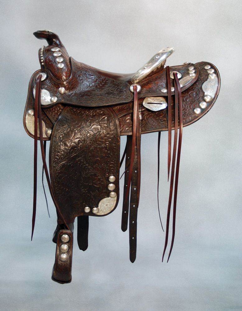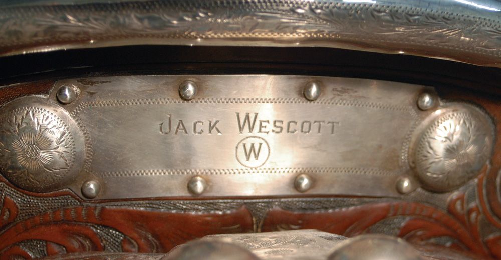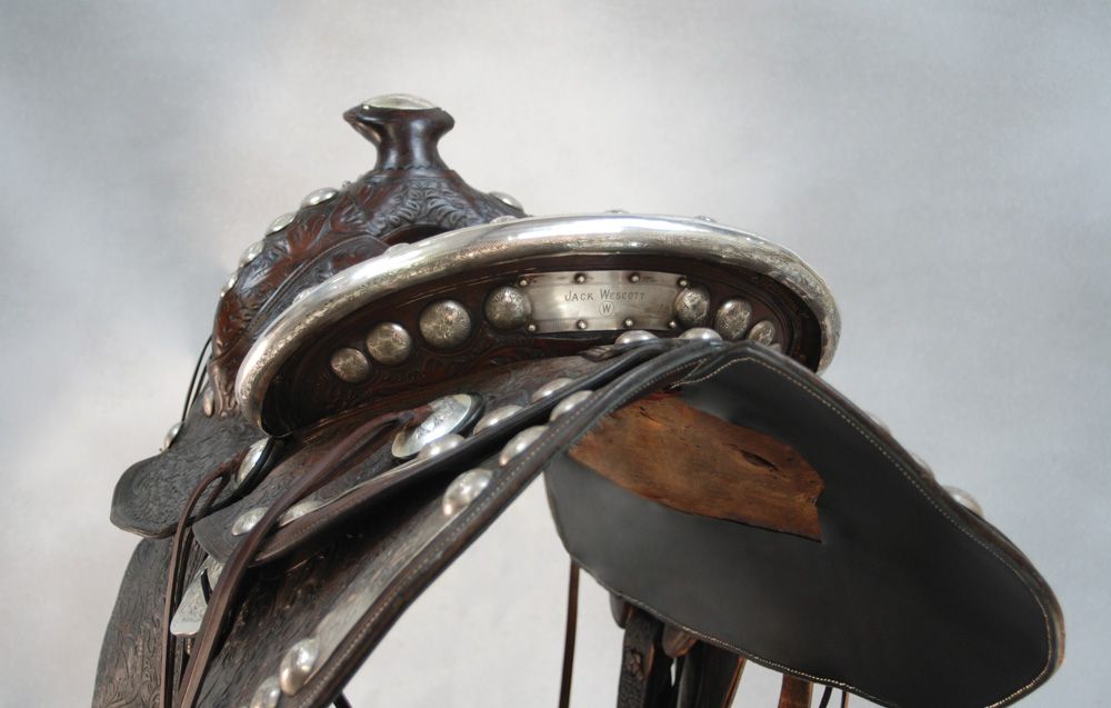 D.E. Walker, Visalia Cal., Silver Show Saddle. Show saddle marked "D.E. Walker Maker Visalia, Cal. Trade Mark" with engraved silver corner plates and graduated silver domes. Brown hand carved leather saddle with silver covered Cheyenne roll cantle, 14 1/2" seat. Jack Wescott with circle W brand engraved on the cantle plate. Sweeping round rear skirts in the classic Visalia style, bright brown color and excellent overall condition. Circa 1930s.