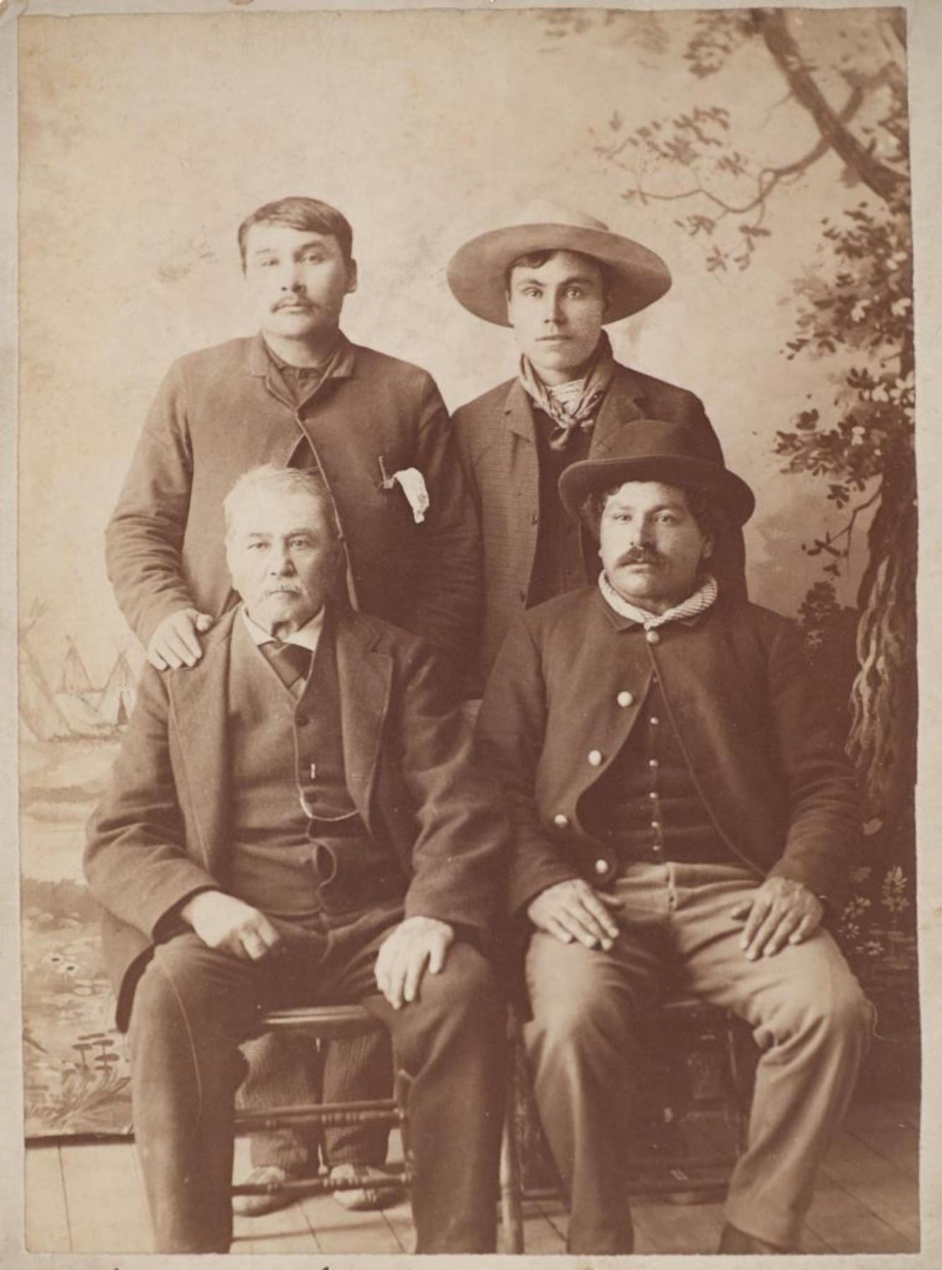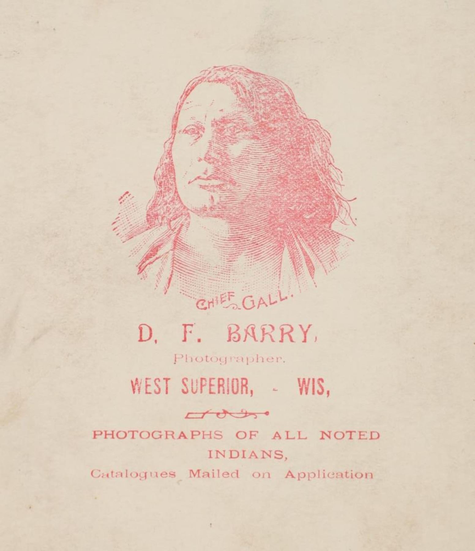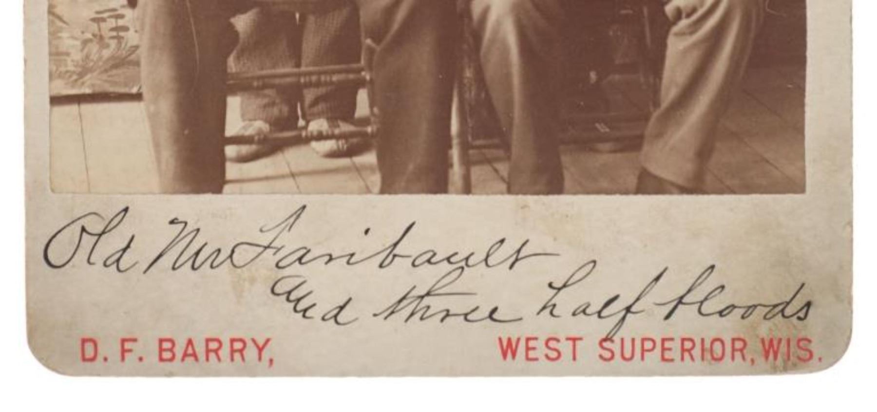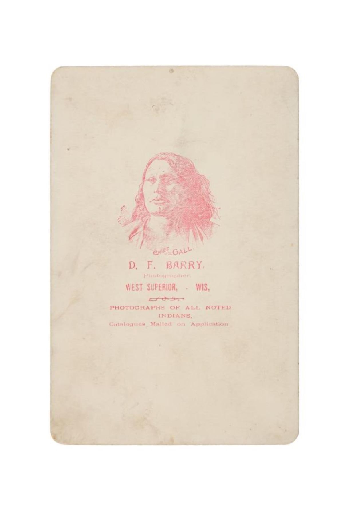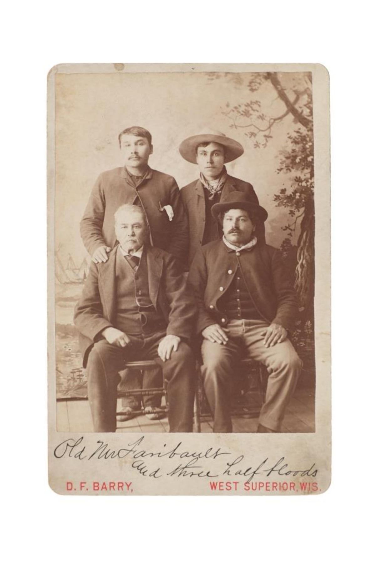 Featured in this lot is this "Old Mr. Faribault and Three Half Bloods" by American photographer David F. Barry born in 1854 and died in 1934; from the ex-collection of the C.M. Russell Museum and John Kleinschmidt. The cabinet card features a wonderfully and professionally crafted original construction that shows a portrait of Mr. Faribault and Three Half Bloods. Alexander Faribault (June 22, 1806 – November 28, 1882) was an American trading post operator and territorial legislator who helped to found Faribault, Minnesota and was its first postmaster. The cabinet card is marked on the front as follows: Old Mr. Faribault and Three half bloods - D.F., West Superior, WIS. The back is marked with the company stamp of D.F. Barry and reads as follows: Chief Gall - D.F. Barry, - Photographer, West Superior - Wis. - Photographs of all the noted Indians, - Catalogues Mailed on Application. Provenance: From the John Kleinschmidt collection which was on loan to the C.M. Russell Museum from 1987 to 1993 and included in the "The Cowboy West: 100 Years of Photography 1992-1993 exhibit. The condition of this D.F. Barry cabinet card is well preserved with some wear to the front and back with some wear to the corners but otherwise shows a well preserved condition. The measurements of this cabinet card is 6 1/2" x 4 1/4". The collective weight of this cabinet card is U4oz.