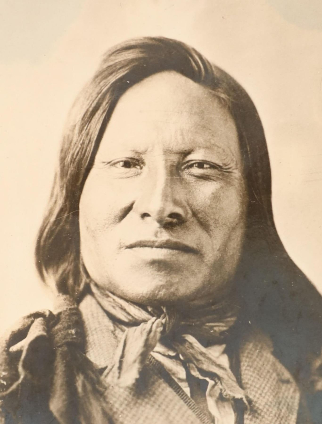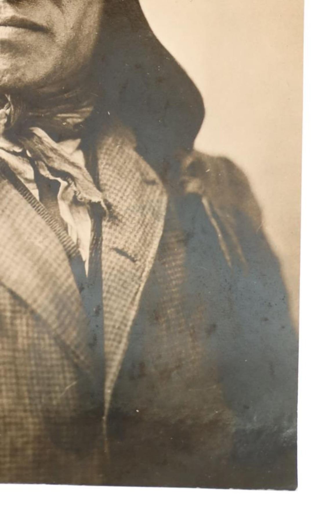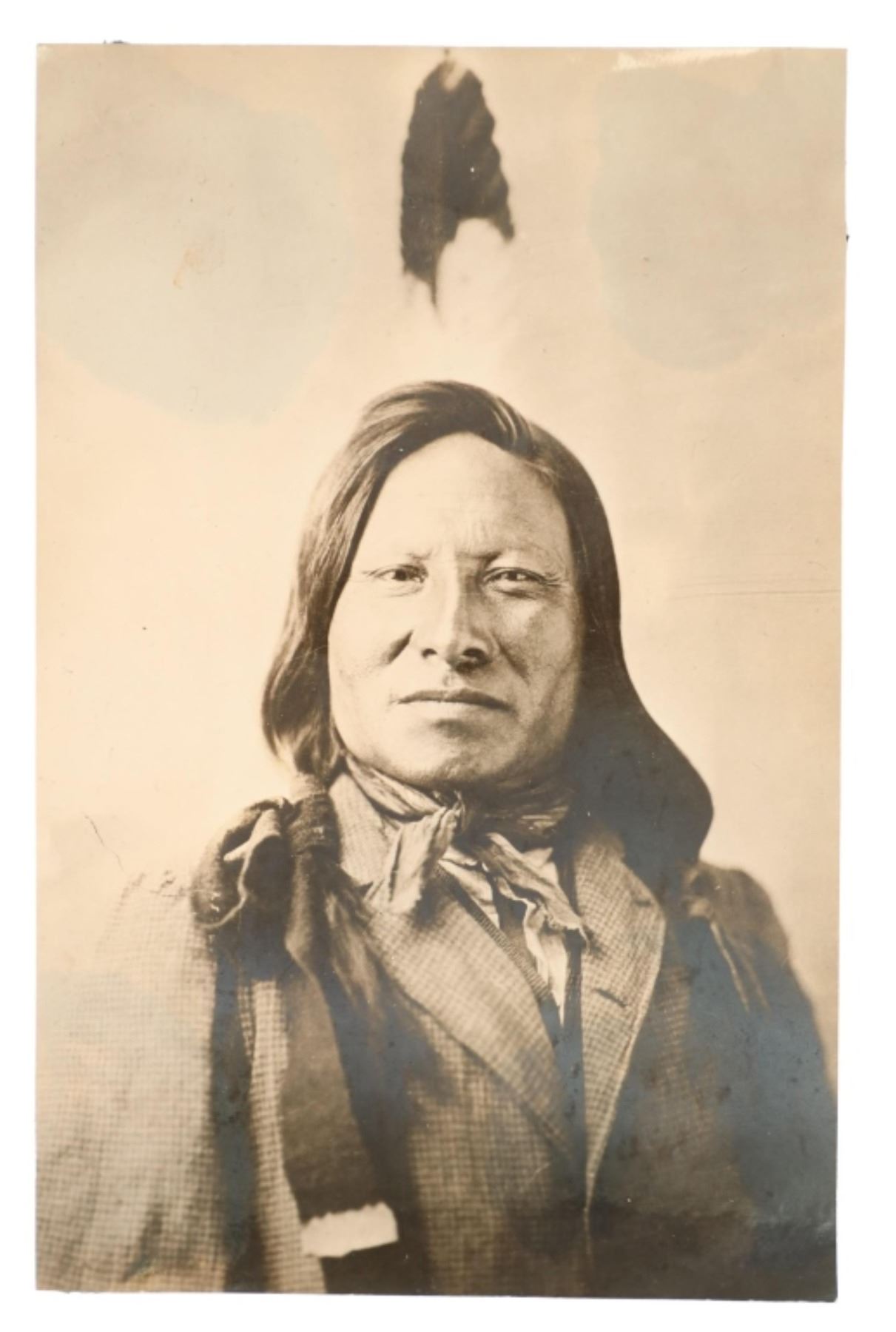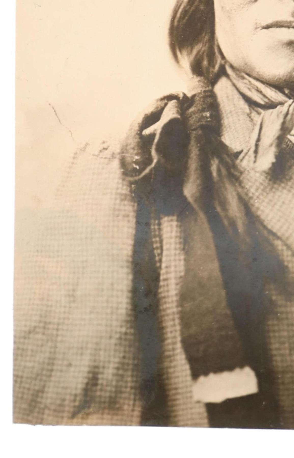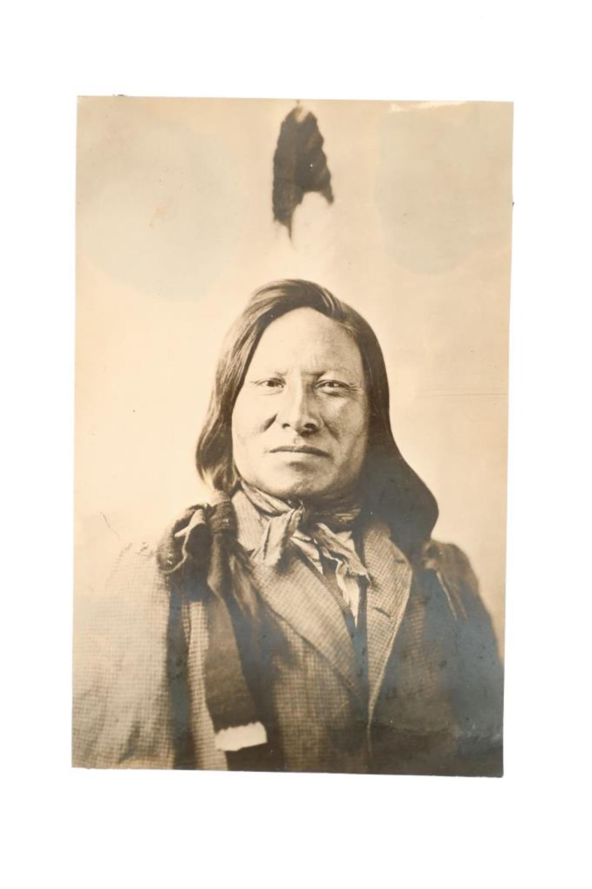 Featured in this lot is an Original D. F. Barry Photograph of Chief Rain-in-the-Face, circa 1885, Bismarck, Dakota Territory. The albumen studio portrait of Rain-in-the-Face seated before backdrop wearing western clothing and hair feather. Barry printed the original seated portrait of Rain-in-the-Face photo on a cabinet card format as well. Rain-in-the-Face was a warchief of the Hunkpapa Lakota who participated in the Battle of the Little Bighorn that defeated the 7th Cavalry Regiment under Lt. Colonel George Armstrong Custer. Provenance: From the John Kleinschmidt collection which was on loan to the C.M. Russell Museum from 1987 to 1993 and included in the "The Cowboy West: 100 Years of Photography 1992-1993 exhibit. An attached museum tag reads, "1396-87 O'Dell". This is considered one of the largest collections of Barry photographs from one historic Montana family offered for public sale. David Francis Barry (1854-1934) was one of the most noted photographers of the American Indian and U.S. Army participants in the Sioux War of 1876 and is attributed with some of the most recognizable surviving images from this period in the history of the American West. Barry first came to the west in the 1870’s to apprentice under photographer O.S. Goff, who worked as the photographer at Fort Abraham Lincoln. It was from this post the Lieutenant Colonel George Armstrong Custer led his Seventh U.S. Cavalry division in May 1876 to the battle of the Little Bighorn in southwestern Montana. This albumen photograph is in amazing preserved condition considering its age of almost 140 years old, album page residue noted on reverse. Measures 3.75"W x 6"L.