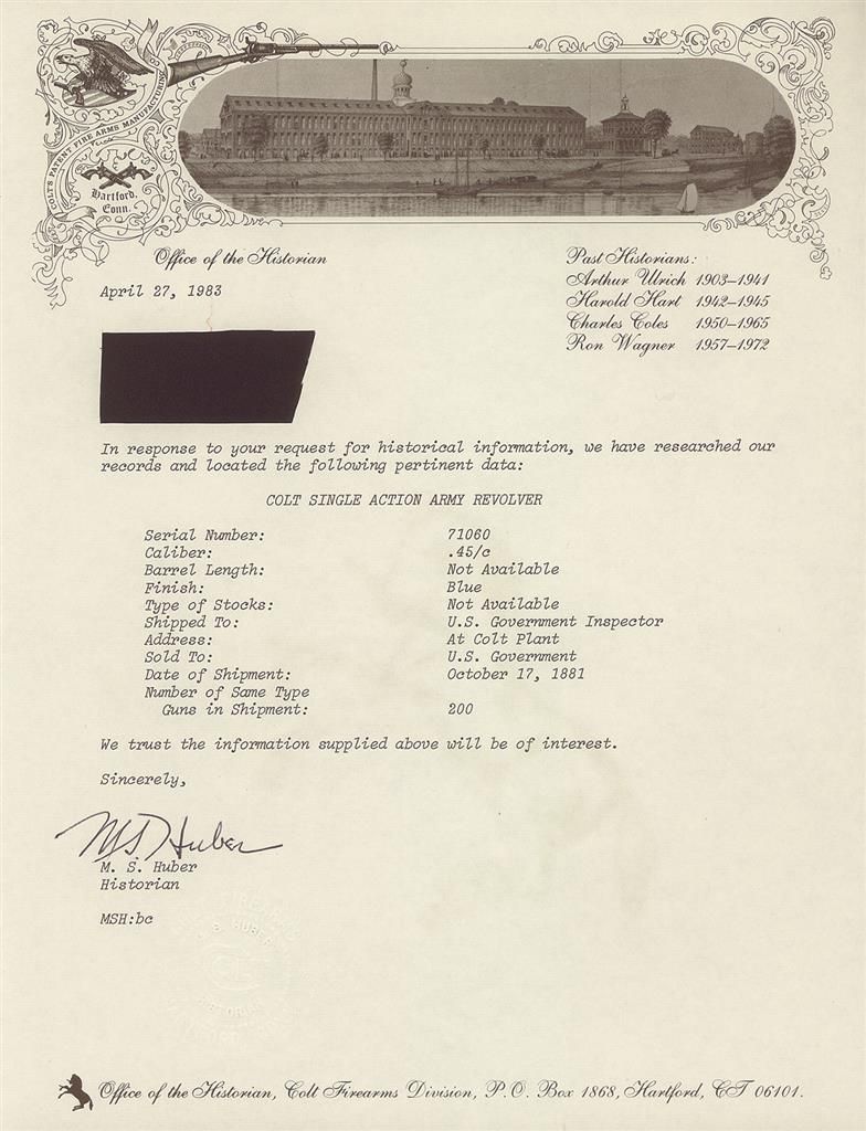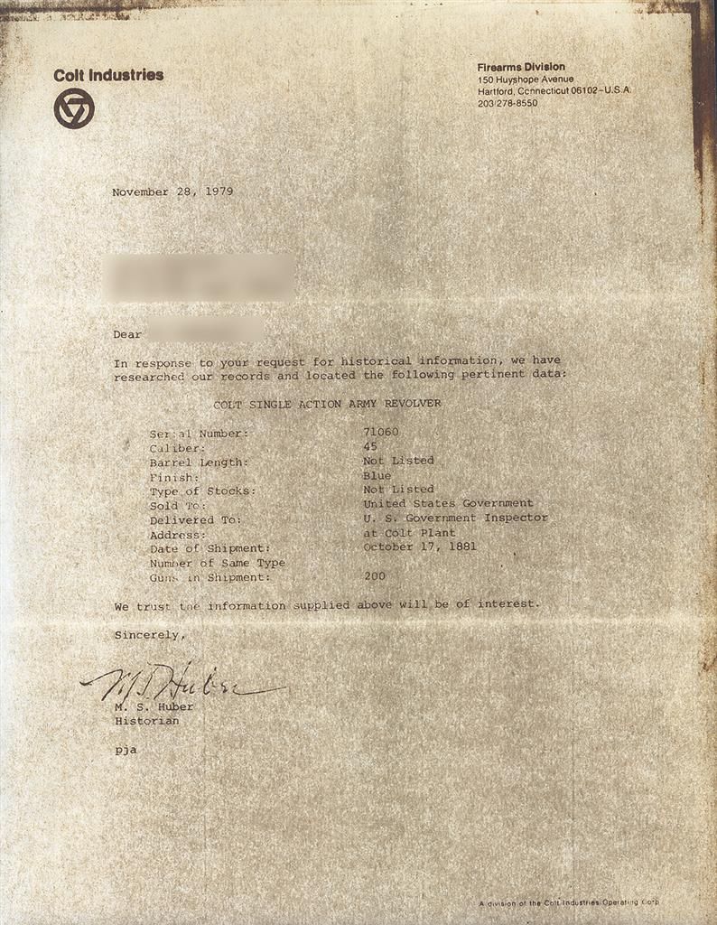 Manufactured in 1881. The barrel has been stretched (was an artillery), and cylinder and trigger guard renumbered. Accompanying factory letter verifies the caliber and blue finish with barrel length and grips "Not Available" and that it was shipped to the U.S. Government Inspector at the Colt plant on October 17, 1881.