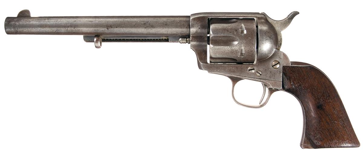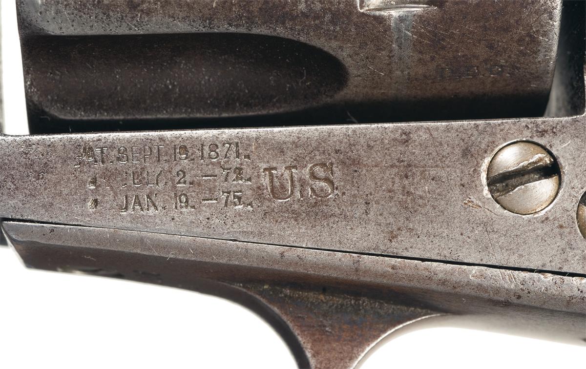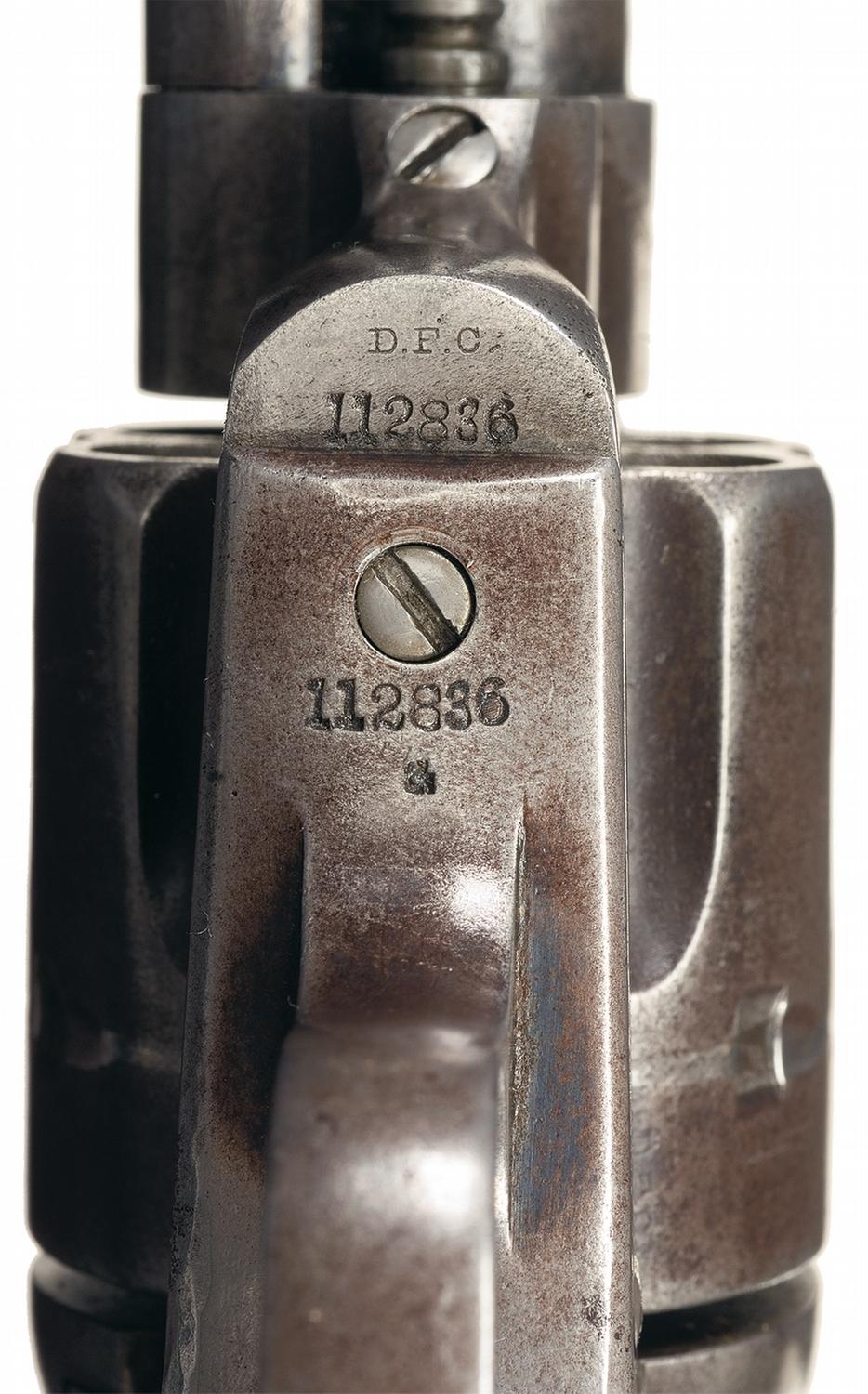 Manufactured in 1884, this U.S. Colt Cavalry SAA revolver features a blade front and frame notch rear sights and the early style "bulls eye" ejector rod head. The top of the barrel is marked with the later block style one line address, the left side of the frame is marked with the three line, three patent date marking followed by "U.S." and the complete matching serial number is marked on the frame, trigger guard and backstrap, and the partial serial number "2836" is marked on the barrel under the ejector rod housing and on the cylinder. The small inspector markings "DFC" (David F. Clark) and "P" are marked on the bottom of the barrel just ahead of the cylinder pin. "P" inspection mark is present on the cylinder and there is a "K" below the trigger guard serial number and "D.F.C." above the frame serial number and on the cylinder. The loading gate is marked with assembly number "1290". The revolver is fitted with smooth one piece walnut grips with a faint oval cartouche on the lower left side.