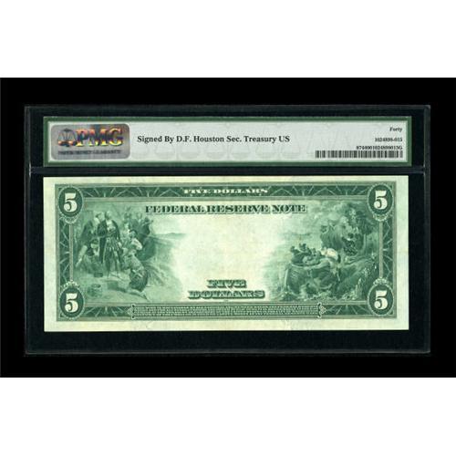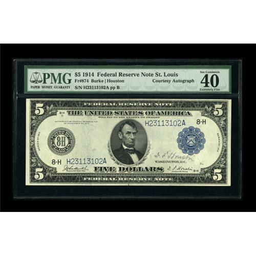 <B>D.F. Houston Courtesy Autograph Fr. 874 $5 1914 Federal Reserve Note PMG Extremely Fine 40.</B></I> This is the only note of this Friedberg number in the census with a courtesy autograph. <BR><BR><b>Shipping:</b> Coins & Currency (<a target="_blank" href="http://www.heritageauctions.com/common/shipping.php">view shipping information</a>)