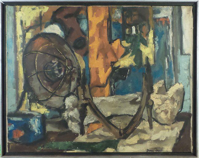 Donna Frost. Modern abstract oil on canvas still life with a fan. Signed lower right, "Donna Frost". [Art: 24" x 30"; Frame: 25 1/2" x 31 1/2"]. Soiling. Minor buckling.