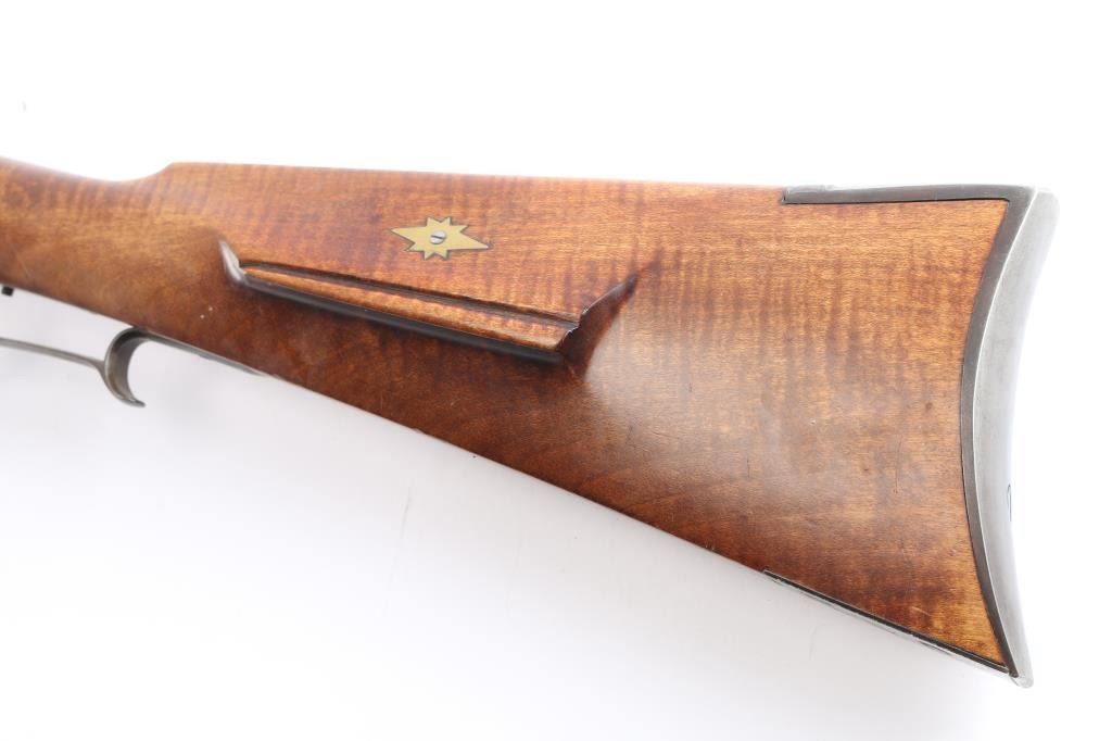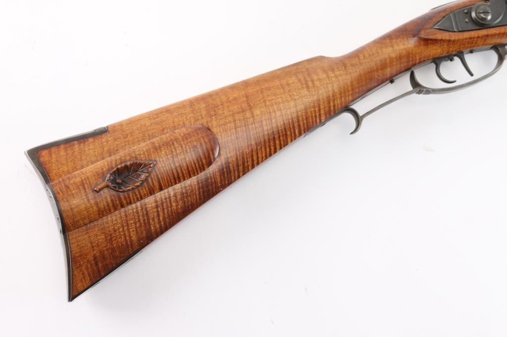 Don Greene custom Flintlock Kentucky Rifle. Don Greene of Staunton, VA passed away in 2015 at the age of 86. Beautiful tiger striped maple stocked rifle features a 42" heavy octagon barrel, German silver front sight blade, fixed notch rear, barrel flat signed "D. Greene" in script, brass tipped wooden ramrod, double set trigger. The stock features a blued escutcheon opposite the lock, elongated brass star escutcheon on the cheek rest and a matching striped maple sliding door to the patch box with a relief carved leaf with button to push to open it. The two-cock hammer action performs well, the stock is excellent and the rifled bore is excellent/bright.