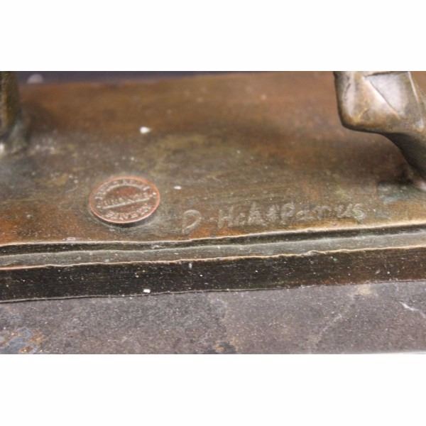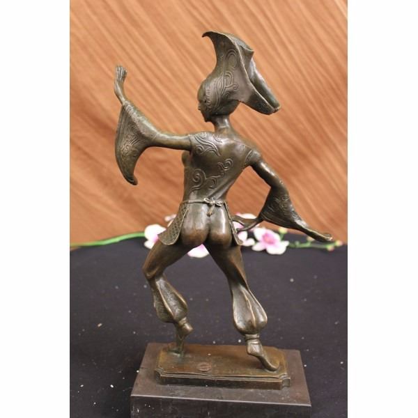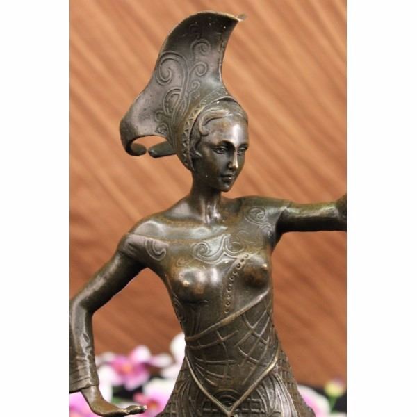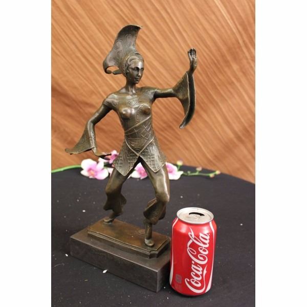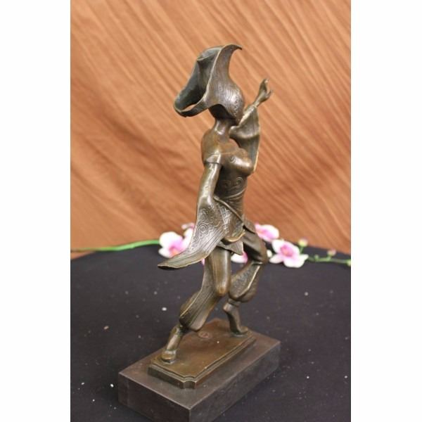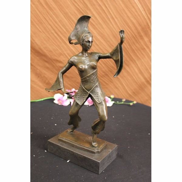 Ease and fierce composure emanate from this Art Deco sculpture. It's a wonderfully designed and executed work of art, from the delicately poised stance of the woman in a gesture very reminiscent of yoga, to the flared details of her outfit. Her beautifully sculpted garment fans out in an interesting pattern that is complemented by an impressive headpiece that resembles a budding flower. Her face is to the side in a look that seems to emanate intense confidence and concentration, further complemented by her majestic pose. She is the epitome of female beauty and grace. Cast in bronze, set atop a black marble base. Signed "Chiparus". This piece is a must-have that will surely be treasured for years to come. Condition: This sculpture is in a very good condition. Bronze Dimensions with Marble Base:Height 15" x Width 11" Marble Dimensions: 7 1/2" X 4". Height without base: 14" Weight : 12 LBS Inventory 90Y2344609