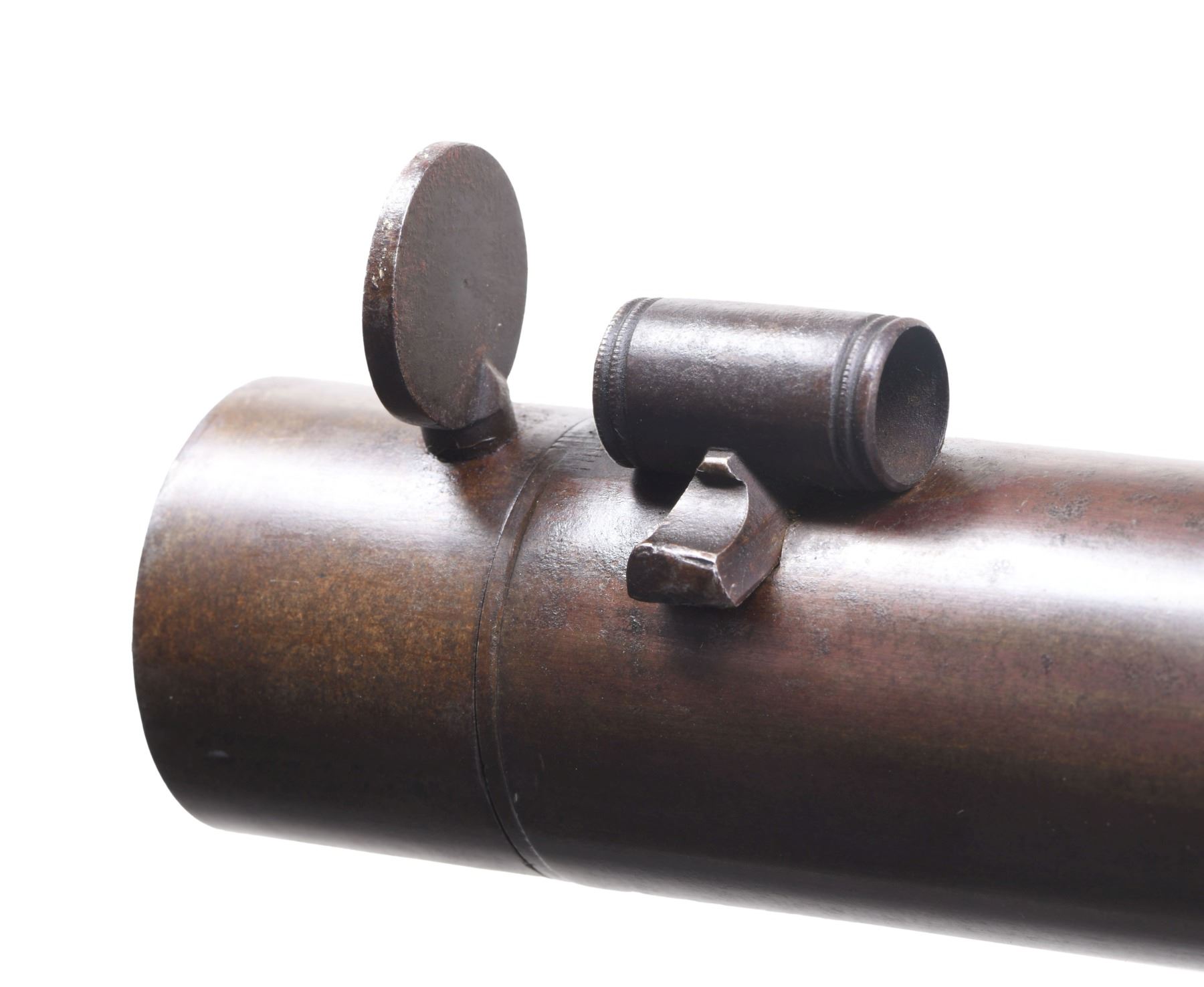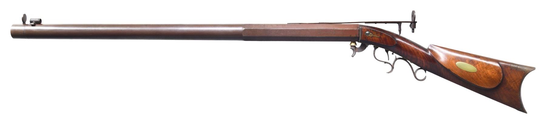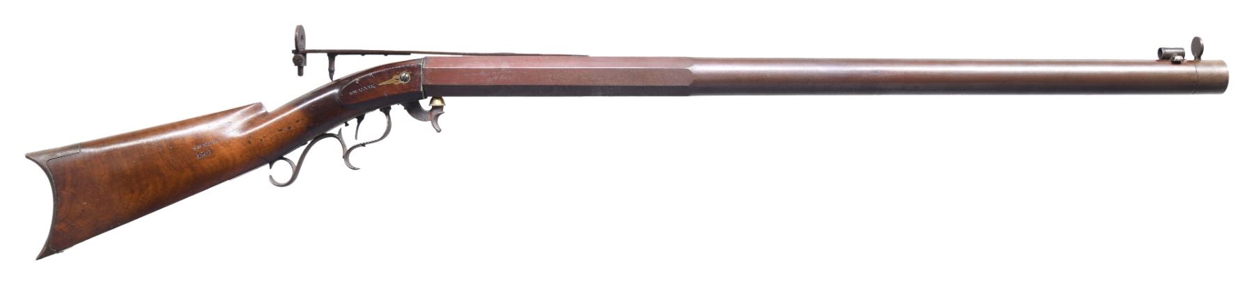 BENCH RIFLE. Cal. 50. NSN. Bbl oct to rnd measuring 30 1/2"; 1 7/16" across muzzle. Overall bbl length w/ false muzzle is 32". Beaded post globe front sight w/ long strap style peep rear sight. Top bbl flat is marked "D.H. HILLIARD / CORNISH / N.H.". As noted in "American Gunsmiths" by Frank Sellers. Hilliard, David Hall, underhammer guns, Cornish, N.H. 1842-1877. Bottom flat is marked "621 1/4" and "1808". Underhammer action. Single set trigger. Cheekpiece walnut stock w/ iron crescent buttplate and finger curl trigger guard. Cheekpiece has an oval brass plate. Right side of stock is stamped "S.W. ALLEN / 1868". Right ear of stock is double stamped "C W ALLEN". WEIGHT: 18 lb 8.6 oz. UNATTACHED ACCESSORIES: short bullet starter, single cavity bullet mold, brass plate, and approx 22 .500 dia cast bullets. CONDITION: bbl has lightly worn brown finish showing some dark spots. Original stock finish shows light wear w/ scattered dents and marks. Sound action and trigger. Bore is generally bright w/ lightly worn rifling showing a very light ring approx 1/2" from muzzle. (01-26552/DS). ANTIQUE. $1,500-2,250.