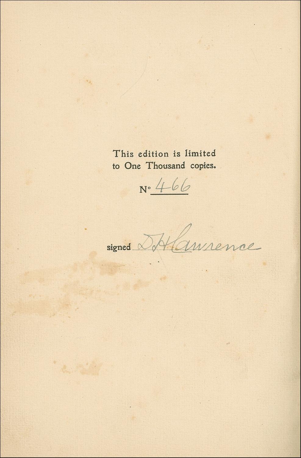 Signed book: Lady Chatterley’s Lover. Limited edition of 1000 copies (this being no. 466). Florence: Privately published, 1928. Handsomely rebound leather hardcover, 6.5 x 9, 365 pages. Signed on the limitations page, “D. H. Lawrence.” In very good condition, with aforementioned rebinding, some light toning and staining to signed page and opening pages, pencil notations to first free end page, and some mild rippling to opening pages. A rare autograph, and a particularly desirable title.
