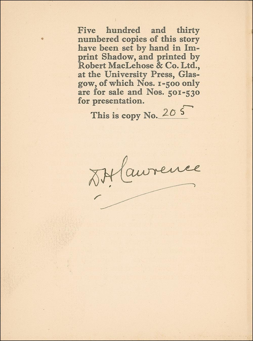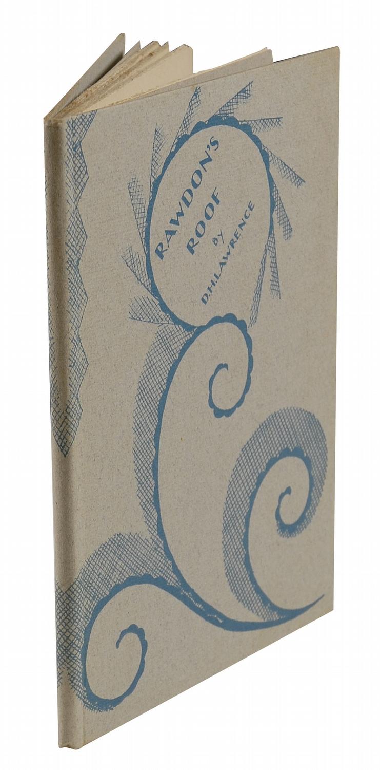Signed book: Rawdon’s Roof. Limited edition of 530 copies (this being no. 205). London: Elkin Mathews & Marrot, 1928. Hardcover with dustjacket, 6 x 8, 32 pages. Signed on the limitations page in fountain pen. Rectangular block of uniform toning to the first free end page, a spot of soiling to the limitation page, and mild edge toning to the dustjacket (heavy along the spine) with a small tear along the spine, otherwise fine condition. A handsome example of one of literature’s most controversial authors.