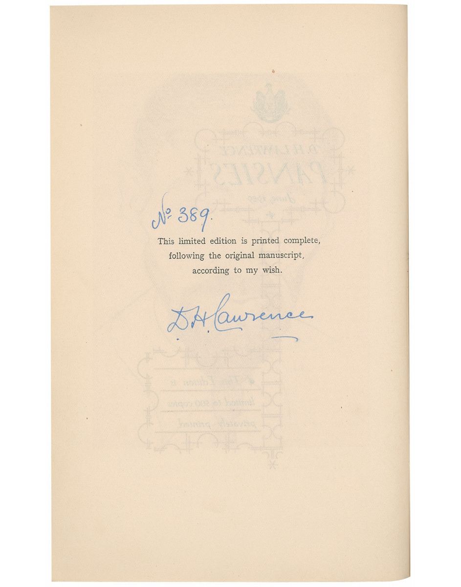 Signed book: Pansies. Limited edition of 500 copies (This being No. 389). London: P. R. Stephenson, 1929. Softcover, 6 x 9, 125 pages. Signed on the limitations page in blue ink, “D. H. Lawrence.” Pencil notations to first free end page, small separation to front joint, and a bit of trivial toning and soiling to covers, otherwise fine condition.
