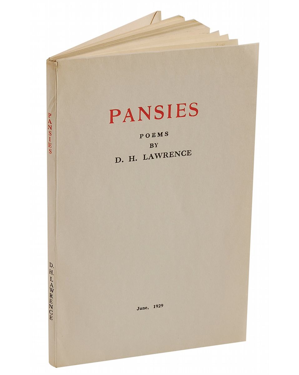 In the wake of his controversial 1928 masterpiece, Lady Chatterley's Lover, Lawrence responded to those critics who flouted the work by writing a series of satirical poems—some of which published under the title ‘Pansies.’ Once again, British censors sought to silence his prose, viewing it as obscene. When authorities temporarily seized his manuscript, Lawrence proclaimed, ‘How sickening this dirty hypocrisy!’ Eventually published in 1929, it became Lawrence's best known collection of poems. The title does not refer to flowers, but is derived from the French ‘pensees’ meaning ‘thoughts’—thoughts that, according to Lawrence in his introduction, come ‘as much from the heart and the genitals as from the head.’