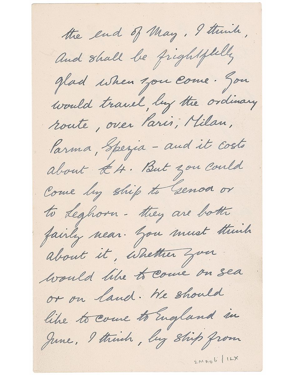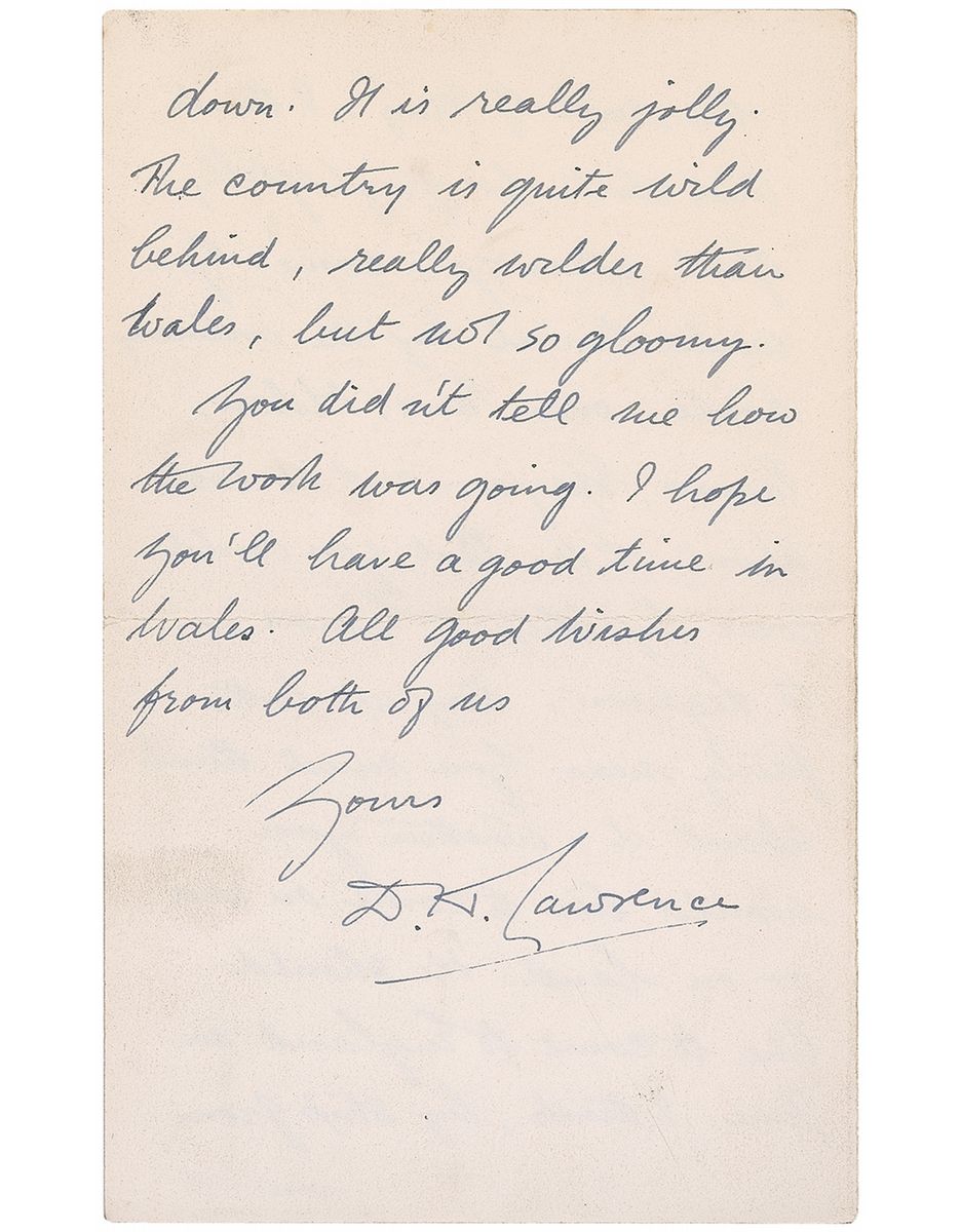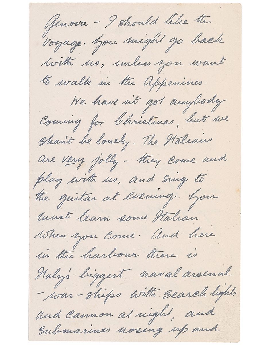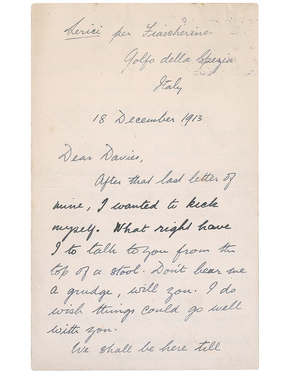 ALS, four pages on two adjoining sheets, 4.5 x 7, December 18, 1913. Lawrence writes to “Davies,” from Lerici per Frascherino, Golfo della Spezia, Italy, in full: “After that last letter of mine, I wanted to kick myself. What right have I to talk to you from the top of a stool. Don’t bear me a grudge, will you. I do wish things could go well with you. We shall be here till the end of May, I think, and shall be frightfully glad when you come. You would travel, by the ordinary route, over Paris, Milan, Parma, Spezia—and it costs about 4 pounds. But you could come by ship to Genoa or to Leghorn—they are both fairly near. You must think about it, whether you would like to come on sea or on land. We should like to come to England in June, I think, by ship from Genova—I should like the voyage. You might go back with us, unless you want to walk in the Appenines. We have’nt got anybody coming for Christmas, but we shan’t be lonely. The Italians are very jolly—they come and play with us, and sing to the guitar at evening. You must learn some Italian when you come. And here in the harbour there is Italy’s biggest naval arsenal—war-ships with search lights and cannon at night, and submariner nosing up and down. It is really jolly. The country is quite wild behind, really wilder than Wales, but not so gloomy. You didn’t tell me how the work was going. I hope you’ll have a good time in Wales.” A few trivial spots of toning, some faint paperclip impressions to the top edges, and some light smudge marks towards the top right corner of the first page, otherwise fine condition.