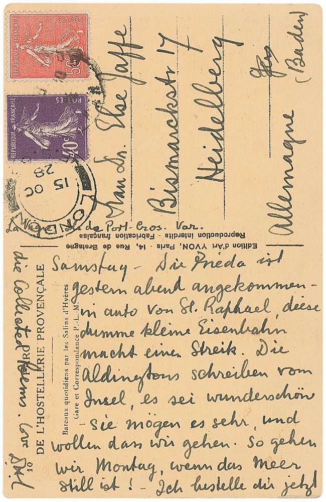 ALS in German, signed “Love, D. H. L.,” on a 5.5 x 3.5 photo postcard of Ile de Port-Cros (Var), no date, but postmarked October 15, 1928. Postcard to “Frau Dr. Else Jaffe” [his sister-in-law] in Heidelberg. In full (translated): “Saturday—Frieda came back last night by car from St. Raphael, because the silly little train was on strike. The Aldingtons wrote from the island, they say it is beautiful, and they enjoy it very much, and want us to join them. So we go Monday, when the sea is calm! I have sent you already my ‘collected poems.’” In fine condition, with a uniform shade of mild toning.