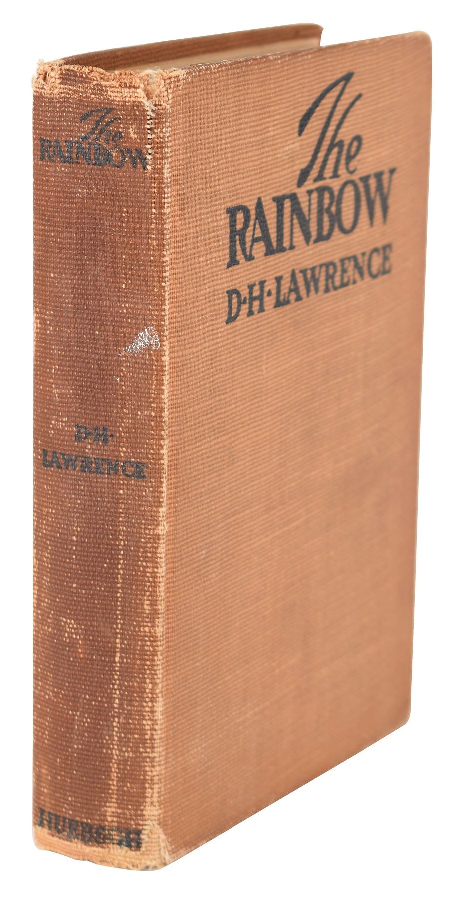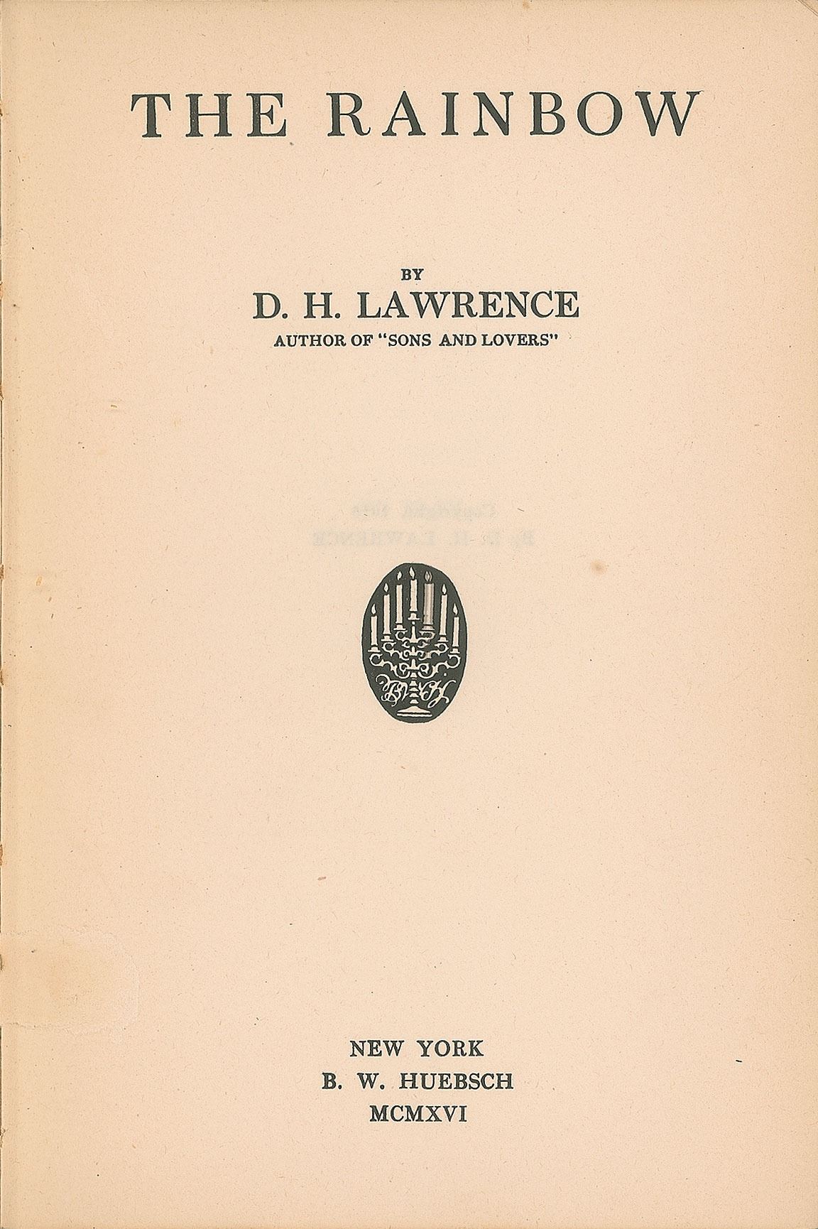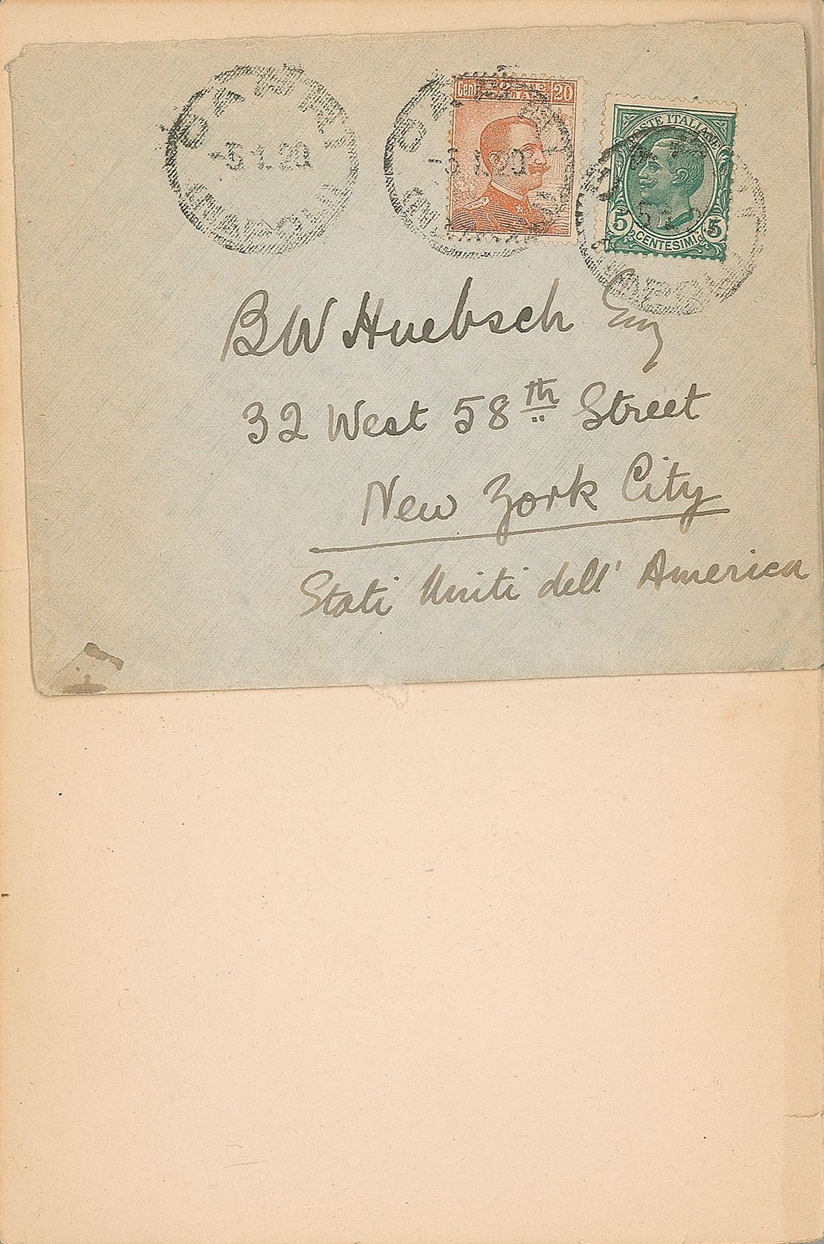 Hand-addressed mailing envelope, 4.5 x 3.75, addressed by D. H. Lawrence to New York publisher B. W. Huebsch: "B. W. Huebsch, Esq., 32 West 58th Street, New York City, Stati Uniti dell' America." Postmarked at Capri on January 5, 1920. Affixed to the detached endpaper of a 1916 edition of The Rainbow, published by B. W. Huebsch. The envelope is in fine condition; the book is poor, with the textblock detached from the binding.