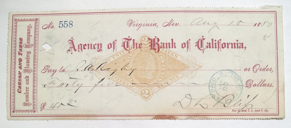 1880 Agency of the Bank of California Check. Imprinted with Carson and Tahoe Lumber and Fluming Company. Signed by Bliss and endorsed by Rigby. The Carson and Tahoe Lumber and Fluming Company was organized in 1873 with Duane L. Bliss as president and general manger and H.M. Yerington, D.O. Mills and J.A. Rigby as stockholders. It was probably the largest and most extensive lumber operation serving the mines of the Comstock. At its peak of operation, holdings included 50,000 acres of timber at Lake Tahoe and Lake Valley, three mills at Glenbrook, two steamers two logging railroads, logging camps, and a narrow gauge railroad. It operated several flumes to transport lumber down the mountain to the railroad depots and also maintained a box factory in Carson City. In the early years, the center of activity was located around Glenbrook, Spooner Summit, and on Clear Creek Canyon, site of the original flume of the Summit Flume Company which was absorbed by the Carson and Tahoe lumber and Fluming Company. The company eventually acquired the property of the Hobart Estate, the Nevada Lumber Co. and the Sierra Nevada Wood and Flume Company as it gradually accumulated timber lands around the Lake Tahoe region. Its major land holdings were located in El Dorado and Placer Counties, California, and in Douglas, Ormsby, and Washoe Counties, Nevada. The Carson and Tahoe Lumber and Fluming Company was cutting timber until logging operations ceased around 1896.