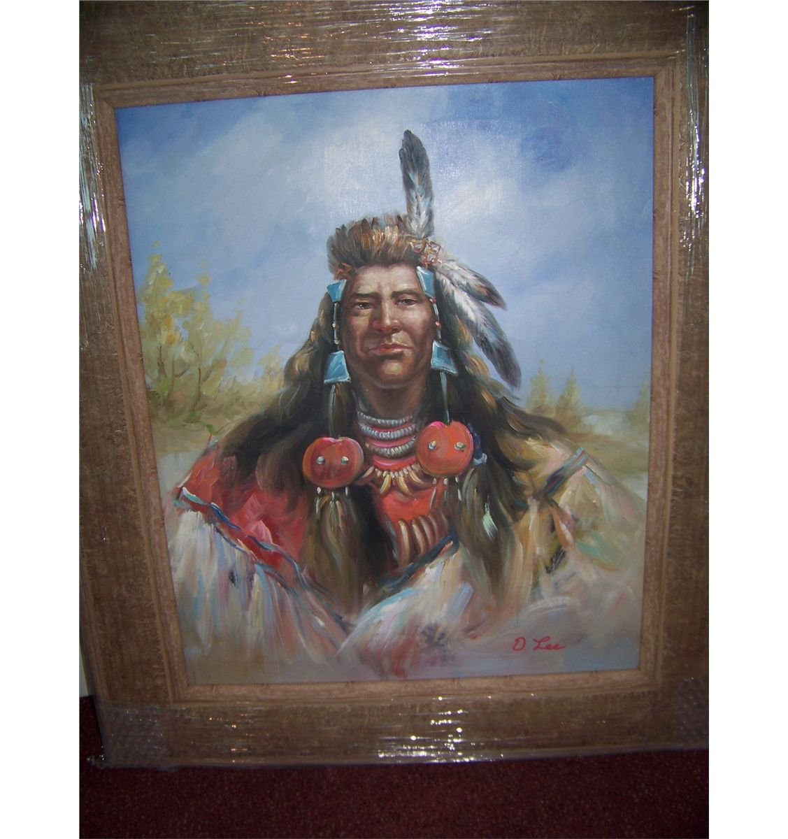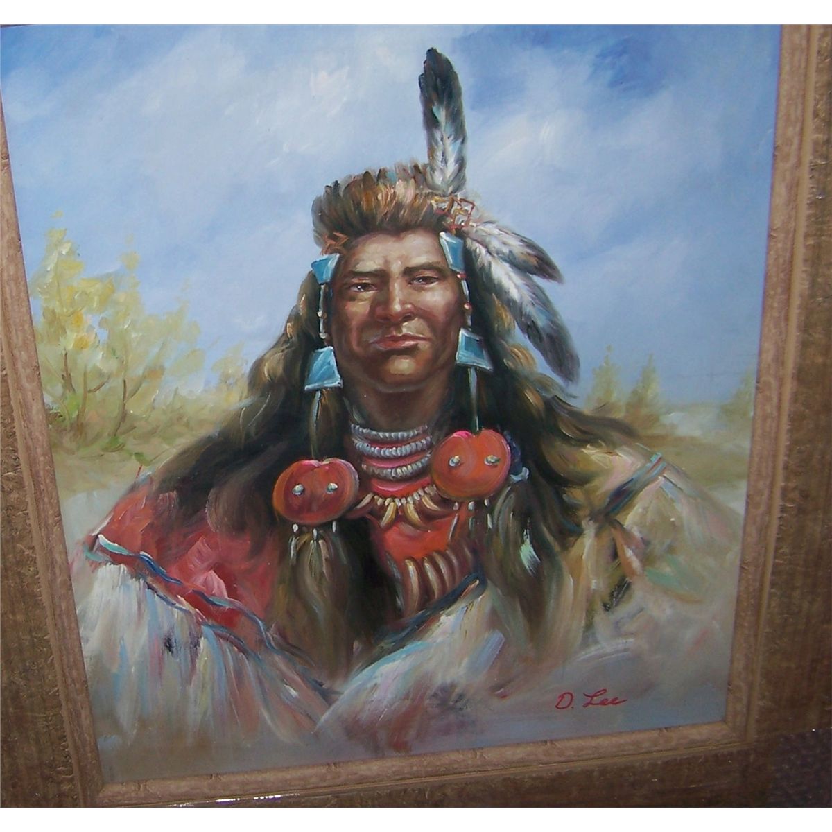 D. LEE, ORIGINAL OIL ON CANVAS PORTRAIT OF AN INDIAN WARRIOR. SIGNED LOWER RIGHT, FRAMED