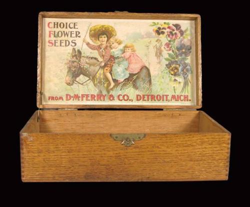 D.M. Ferry Flower Sead Box with Paper Label. Missing Clasp.