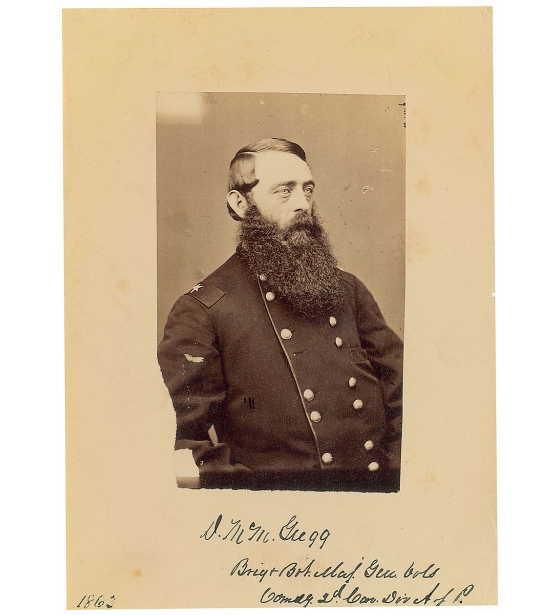 Union officer who commanded in the Army of the Potomac. Original 3.75 x 5.25 cabinet photo, signed in the lower border in black ink, “D. M. M. Gregg, Brig & Bvt Maj Gen Vols, Comdg 2d Cav Div A of P.” In very good condition, with photo having been separated from the backing (not included), small tear to top edge, and trimmed edges.