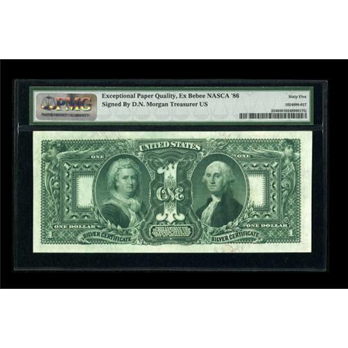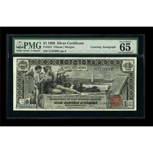 <B>D.N. Morgan Courtesy Autograph Fr. 224 $1 1896 Silver Certificate PMG Gem Uncirculated 65 EPQ.</B></I> D.N. Morgan was Treasurer of the United States from June 1, 1893 to June 30, 1897. Morgan placed his signature immediately above his engraved signature. This note has four abundant margins. This note's provenance can be traced back to Aubrey Beebe.<BR><BR><b>Shipping:</b> Coins & Currency (<a target="_blank" href="http://www.heritageauctions.com/common/shipping.php">view shipping information</a>)