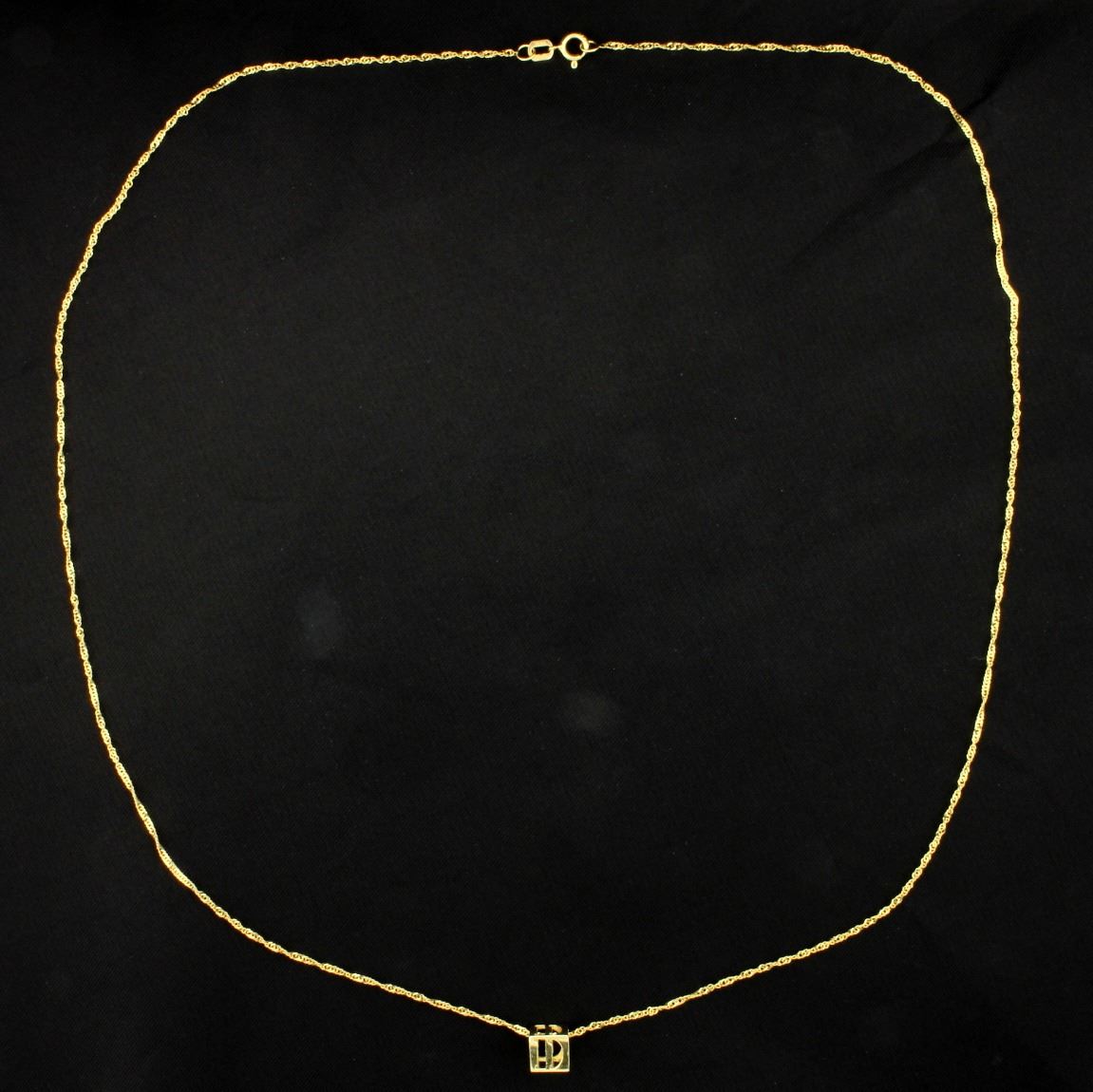 14K yellow gold, the 1/4 inch square pendant is on a 21 1/4 inch chain, that has a lobster clasp.           1.8g