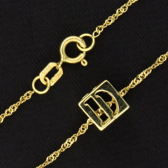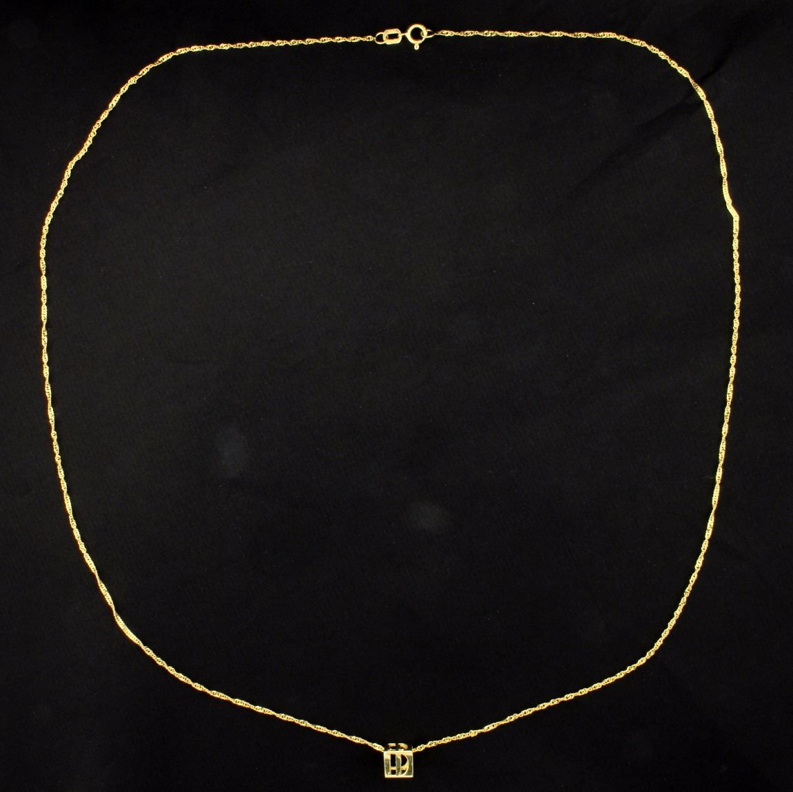 14K yellow gold, the 1/4 inch square pendant is on a 21 1/4 inch chain, that has a lobster clasp. 1.8g
