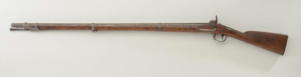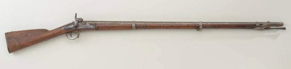 D. Nippes U.S. contract flintlock musket converted to percussion, .70 cal., 42” barrel, full stock, iron ramrod, lockplate dated 1846. This gun is in overall well-worn condition with moderate pitting at firingarea, good action, dark bore, wood stock shows an old repair at the top of the wrist including an old replacement bolt in the top tang; two partially visible inspector’s cartouches on the left side of the stockabove the trigger area; only approx. 5,600 of these guns were manufactured on contract to the U.S. government between 1842 and 1848. Est.: $600-$1,200.