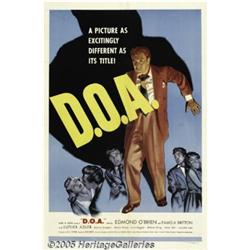 <B>D.O.A. (United Artists, 1950)</B></I> One Sheet (27" X 41"). Told in flashback style, "D.O.A." is one of the definitive film noirs of the late 1940s, early 1950s era. Edmond O'Brien stars as vacationing CPA, Frank Bigelow, who ingests a deadly poison and is told by a doctor he only has a few hours to live. Frantically, Bigelow retraces his movements for the last 24 hours, trying to locate his murderer. There is slight fold line wear with a touch more at the crossfolds, corner pinholes, and slight border chips and dings. The poster has been professionally restored, rendering these defects hard to detect. Very Fine on Linen.