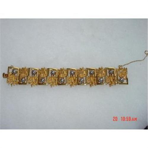 WOW! Thats all I can say about this newer Costume Jewelry Designer! All I know from researching on line is that this is a company out of Canada and owned by Sandra Boucher. I'm not sure if this is a relative of the famous BOUCHER company but I would not doubt it. This is one of the koolest gold with silver balls link bracelets I've ever seen!! It has a safety clasp and signed D'ORLAN. This is 7 1/2 inches long. This is diffintely quality and will be appreciating and I bet quite collectible. Very fine made costume bracelet! Look at the unique gold pieces how they go up and down, I cannot describe it, but hopefully the pictures show this!