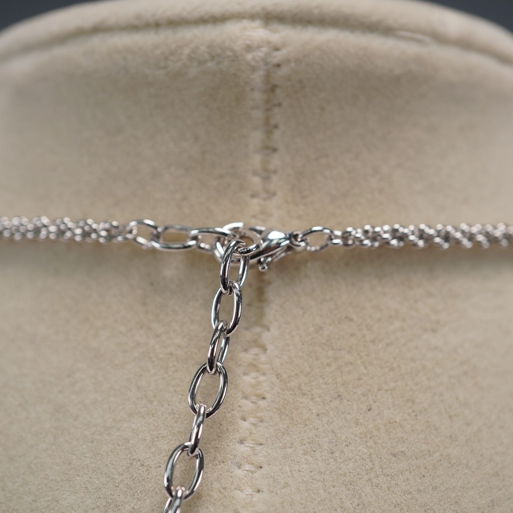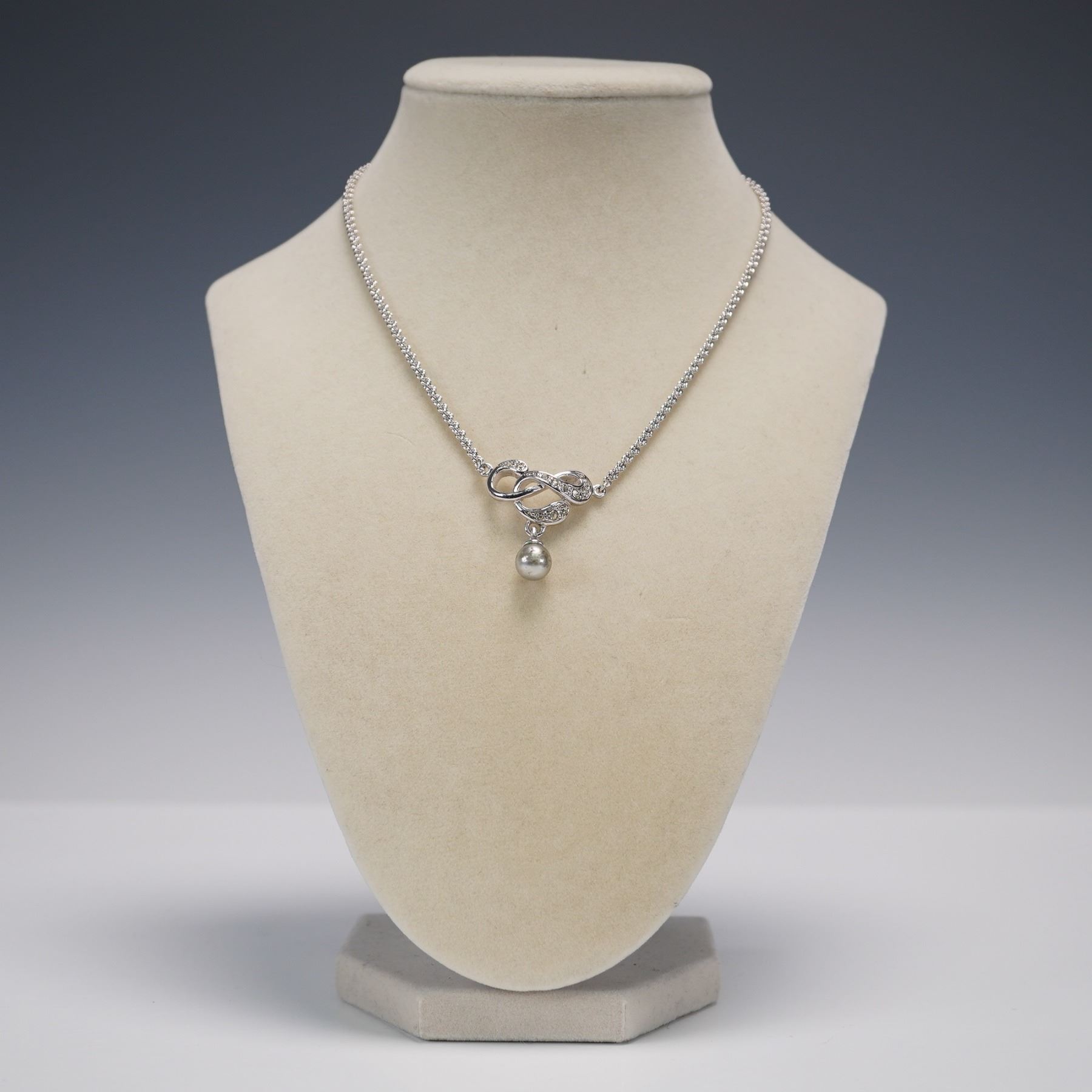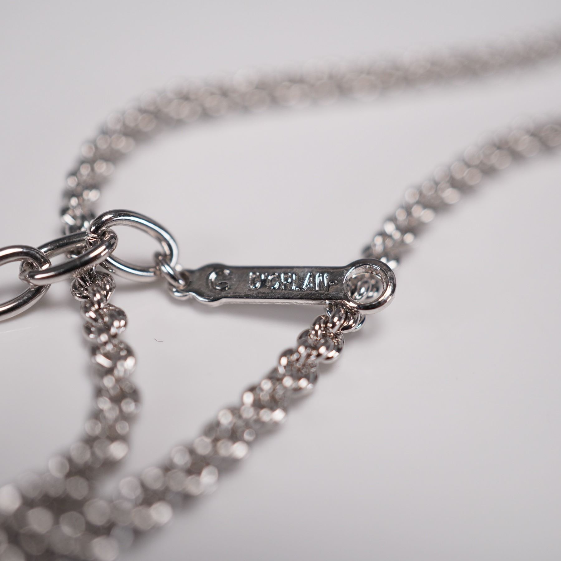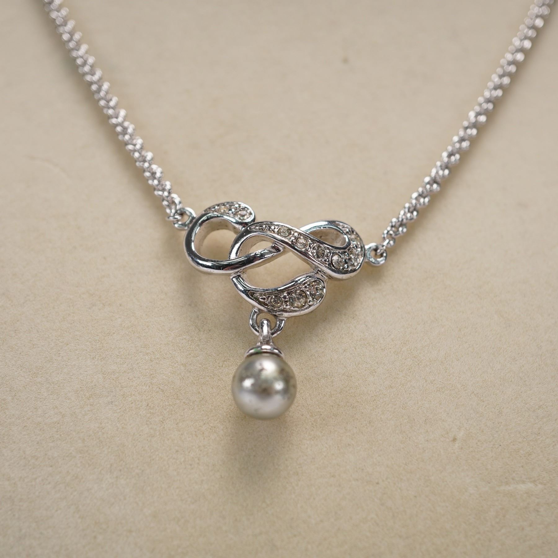 This vintage D'Orlan silver-tone necklace showcases elegant craftsmanship with a bright, rhodium-plated rope chain and an intricate looped centerpiece adorned with sparkling clear rhinestones. A single faux pearl drop adds a refined accent, lending timeless sophistication to the design. The necklace is signed D'Orlan on the clasp tag and fastens with a lobster clasp and extender chain for adjustable length. D'Orlan Jewelry Ltd., founded in Canada in 1957 by Maurice Bradden, became renowned for its high-quality costume jewelry, often collaborating with designers like Nina Ricci. Measures approximately 17"L clasp to clasp.