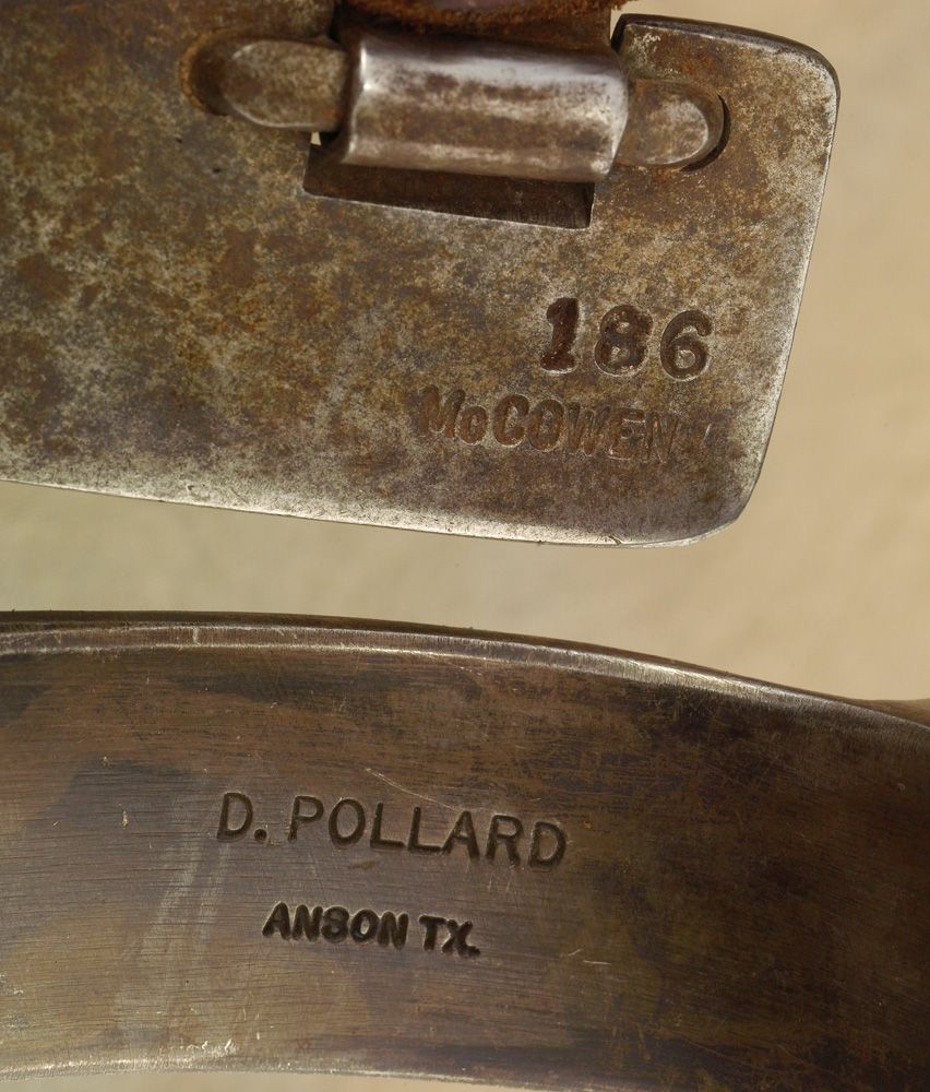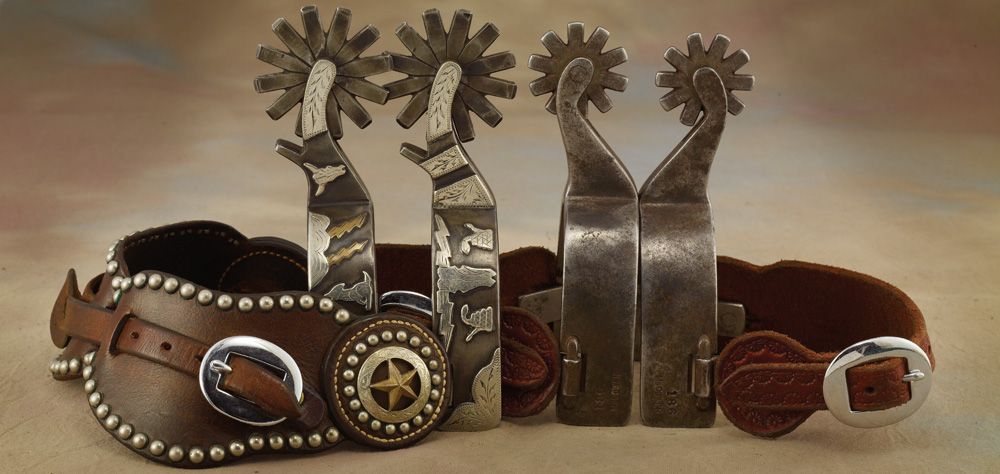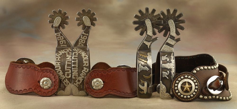 a) D Pollard / Andon, TX maker-marked inside the heel band. Double-mounted silver and copper overlaid spurs with silver longhorn and coiled rattlesnakes on the front, and howling coyote, crescent moon, clouds and lightening on the offside. Swinging buttons, 2 1/4", 12-blunt point rowels, nickel studded straps with Texas star concho. Unused condition; b) Maker-marked McCowen 186 trophy spurs presented at the 1984 Seymour Ranch Cutting horse competition. Swinging flower buttons, 1 3/4" 10-blunt point rowels. Very fine condition