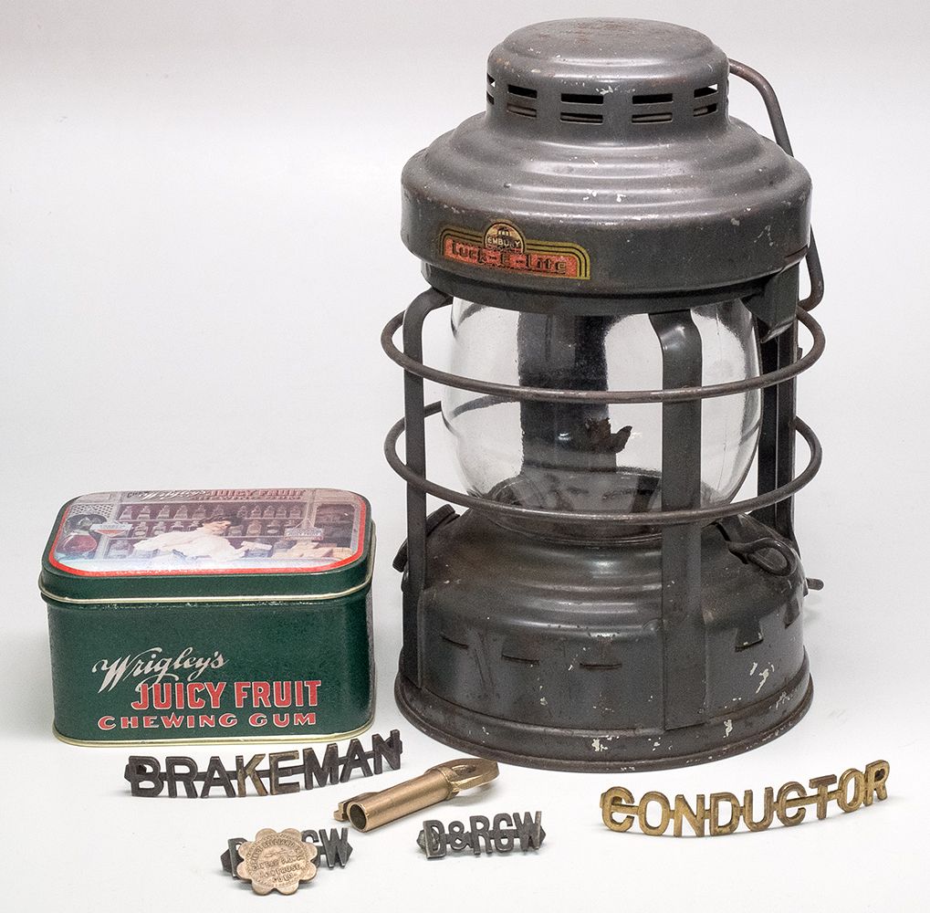 This is an interesting and rare lot featuring items from The Denver & Rio Grand Railroad. The main item is an Embury Luck-E-Lite, No. 25 wall bracket lantern that was used in either one of the passenger cars or caboose. The gray painted lamp measures 9”x 6” and is completely intact. Also included are hat pins that were worn by “CONDUCTOR” and BRAKEMAN” as well as the railroad logo. These too are in very good condition. There is also a brass switch key from the railroad. This is a very nice group of items for the railfan. - HKA#65331