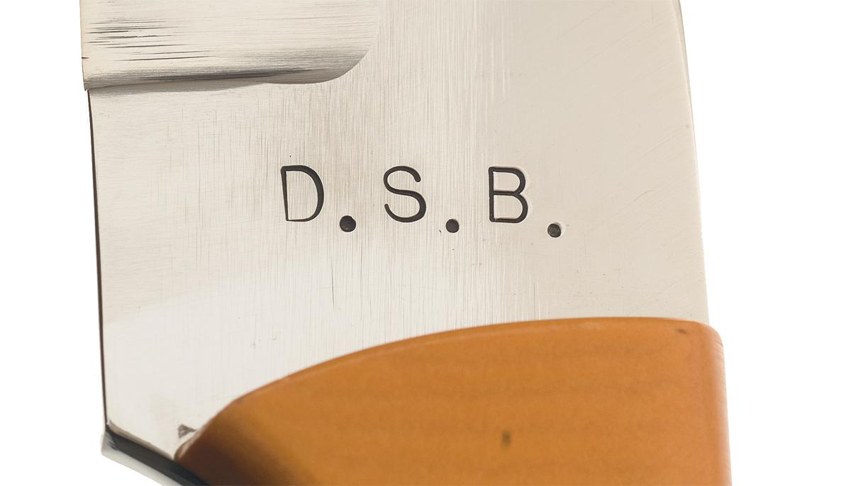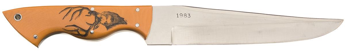 The knife has a 7 inch blade marked "D.S.B." and dated "1983". Consignor states that the knife was handcrafted by D.S. Brua. Fitted with micarta scales secured to the tang with five rivets with an attractive scrimshaw stag head on the right scale which is signed by the artisan ("CIL"). OAL: 12 1/4".