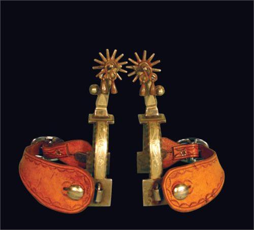 D.Vogt Silver Inlaid Spurs, single mount. Tooled leathers. Very good condition.