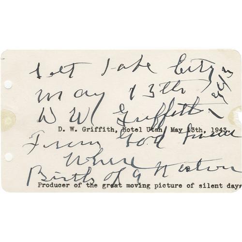 <B>D.W. Griffith Autograph.</B></I> A 3" x 5" autograph album page signed "Salt Lake City, D.W. Griffith," with a difficult-to-decipher line under his signature followed by "Birth of a Nation" and "May 13, 1943" in black fountain pen. Released in 1915, <I>Birth of a Nation</B></I> introduced many of the basic cinematic techniques still used in filmmaking; this is a rare mention of the historically significant and highly controversial movie in Griffith's own handwriting. The page is in Very Fine condition, with collector's typed notations along the bottom, punch holes to the left edge, and unobtrusive mounting remnants to two edges. Griffith, known as "The Shakespeare of the Screen" and "The Man Who Invented Hollywood," was sadly forgotten by the film colony and hadn't directed a film in 12 years at the time he signed this autograph. <I>Accompanied by LOA from PSA/DNA.</B></I><BR><BR><b>Shipping:</b> Small Flat (<a target="_blank" href="http://www.heritageauctions.com/common/shipping.php">view shipping information</a>) <BR><BR><B>Important no
