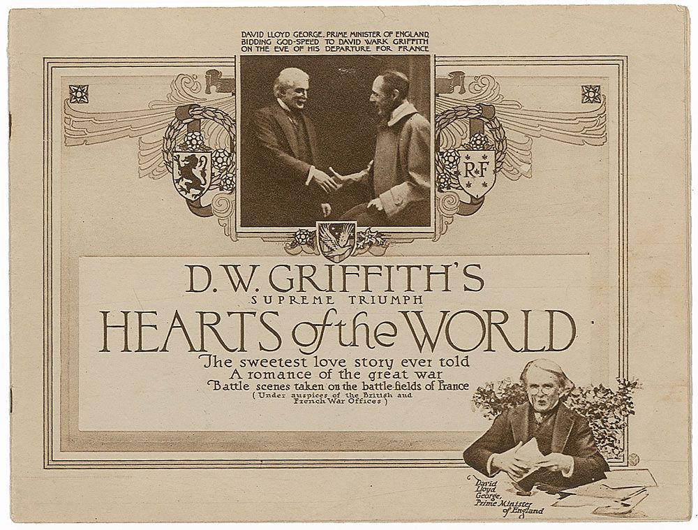 Original unsigned vintage program for Griffith’s Hearts of the World, 12 x 9, 24 pages, complete with two color pages, with information and photos from Griffith’s wartime classic. In very good to fine condition, with expected handling wear, some small tape repairs to bottom edge of back cover, and a yellow artist’s pencil mark to back cover.
