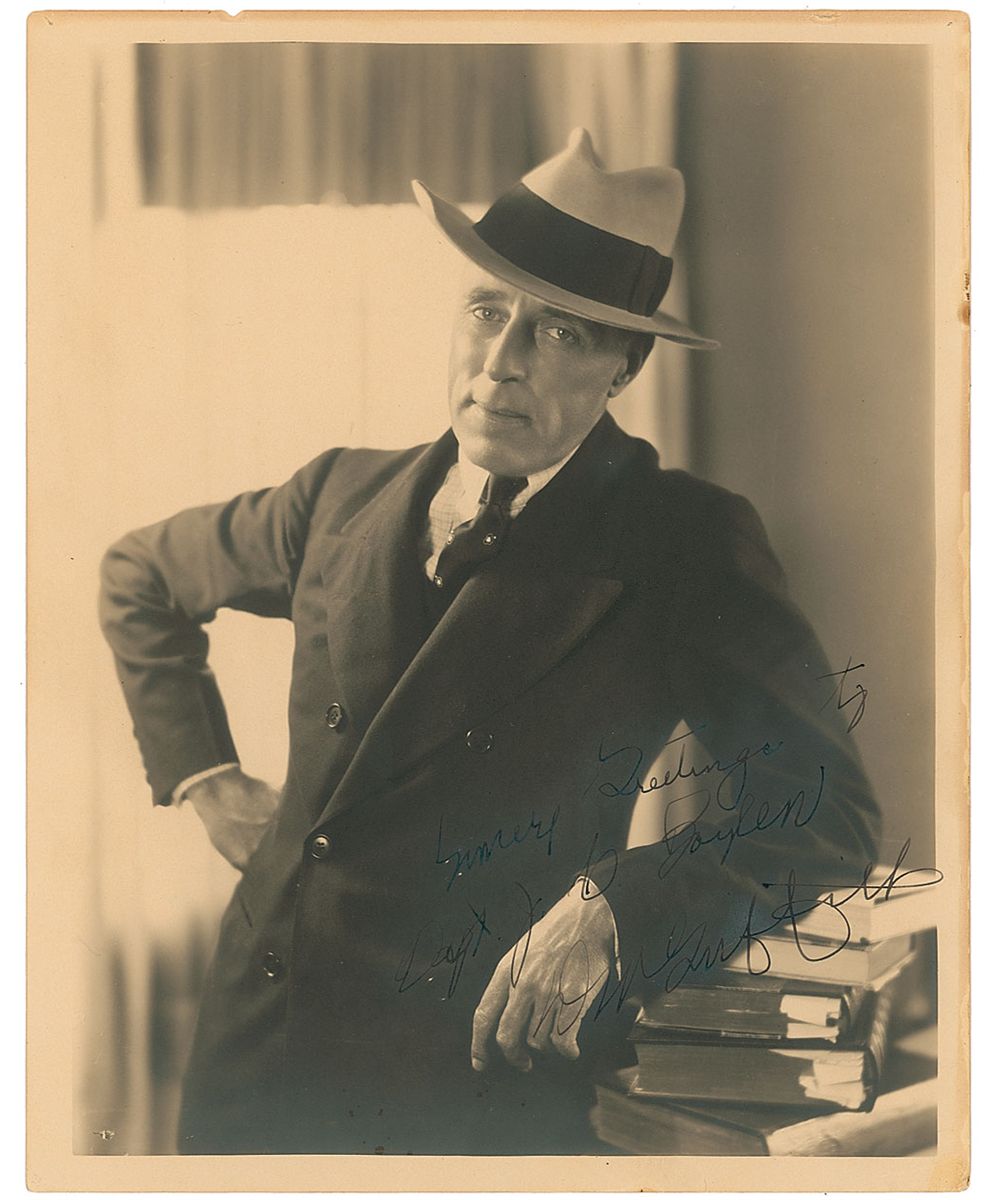 Trailblazing filmmaker (1875–1948) who directed a number of important early classics, including Intolerance and the iconic Birth of a Nation. His innovative use of the fledgling medium resulted in a repertoire and vocabulary of film technique that remains influential to this day. Exceptional vintage matte-finish 8 x 10 half-length portrait of Griffith looking dapper, signed and inscribed in black ink, “Sincere greetings to Capt. J. C. Boylan, D. W. Griffith.” Trivial edge toning, two unobtrusive pinholes and a couple chips to upper edge, and moderate contrast to portions of inscription and signature, otherwise fine condition. A rarely seen format and terrific pose.