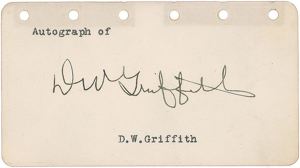 Trailblazing filmmaker (1875–1948) who directed a number of important early classics, including Intolerance and the iconic Birth of a Nation. Vintage fountain pen signature, “D. W. Griffith,” on an off-white 4.5 x 2.5 page. In fine condition, with slight show-through at top from mounting remnants to reverse.