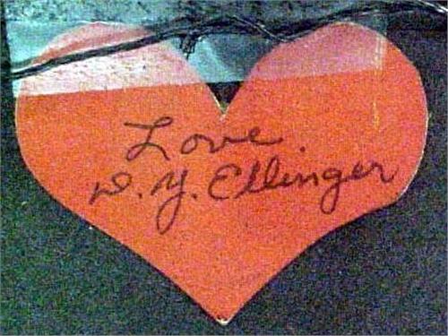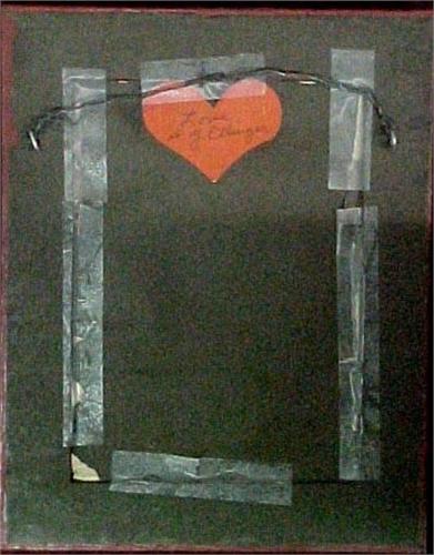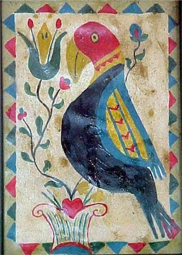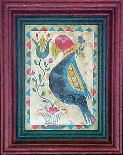 D.Y. Ellinger tempera emulsion (egg white) on paper; parrot with tulip; image measures 6 ½” x 4 ½” in original frame; with paper heart on reverse “Love, D. Y. Ellinger” (discoloration in places)