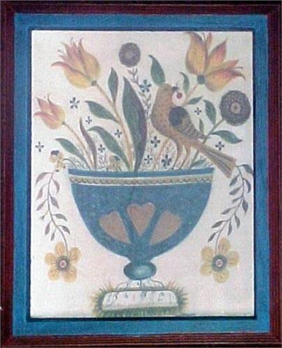 D.Y. Ellinger tempera emulsion (egg white) on paper; parrot with tulip; image measures 6 ½” x 4 ½” in original frame; with paper heart on reverse “Love, D. Y. Ellinger” (discoloration in places)