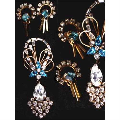 This 1950?s long hanging brooch also doubles as a pendant which hangs on a necklace. I have also included earrings. This is one of Ralph Scudieri pieces and is signed D?eri. These are very far and few between. This one measures 3" long and is marked 12kt gold filled as well as being signed. There is a pin back as well as a hook that hangs over a necklace. The earrings are tasseled drops and they are screw on. The large tear drop stone is brilliant on the hanging pendant that swings when you walk. Notice the setting on the back of it as well. This is really a well made piece and reminds you of the early Trifari pieces.