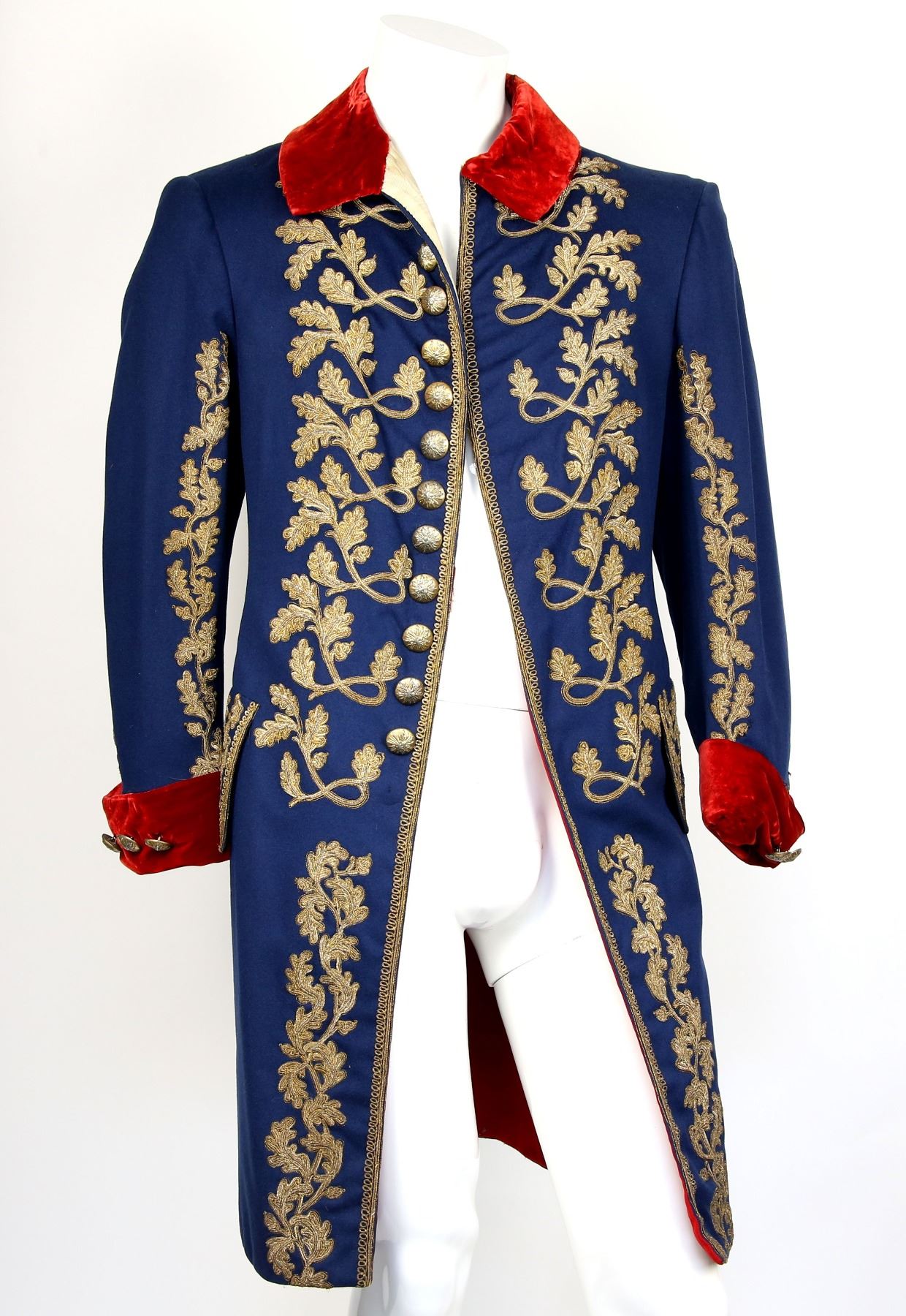 Désirée (1954) - Blue tailcoat jacket with allover gold foliate motif to front and red velvet collar and cuffs, from the film starring Marlon Brando and Jean Simmons. Inscribed Western Costume Co wardrobe label (No. 22220, Name: Troy Sams, Chest: 42), barcode label (40424356) and other ink inscriptions within.