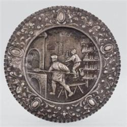 19. sz. utolsó harmada(?), ezüst, fantázia jegyekkel, kerek forma, cizellált alakos és peremén növényi mintás dísszel, öblében pékmuhely jelenettel, hátulján cinelt fém függesztovel, 608 g; d: 32 cm