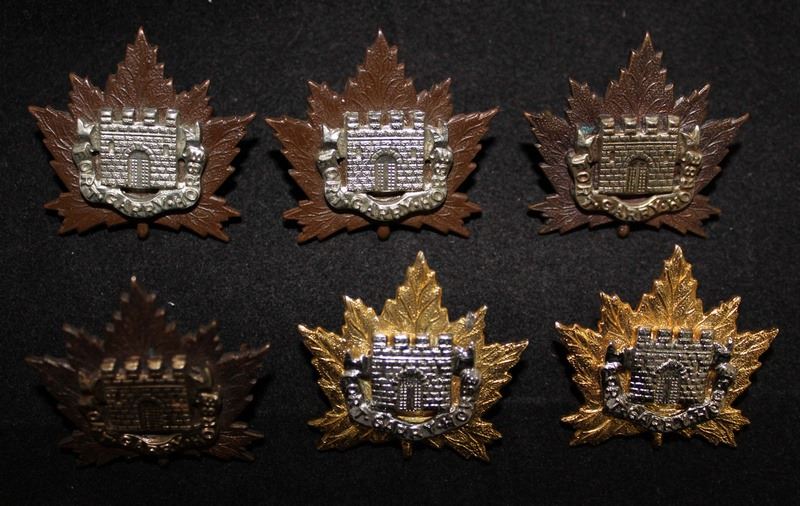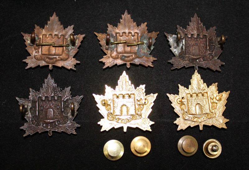 4 - Wavy type banner, slight different shades of white metal on dark bronze Maple Leafs, lug fasteners, two marked BIRKS on the back one of these have one lug replaced. 2 - Dull gold coating, white metal overlay, clutch pin fasteners. Nice lot. Mazeas C50a. Lot of 6.