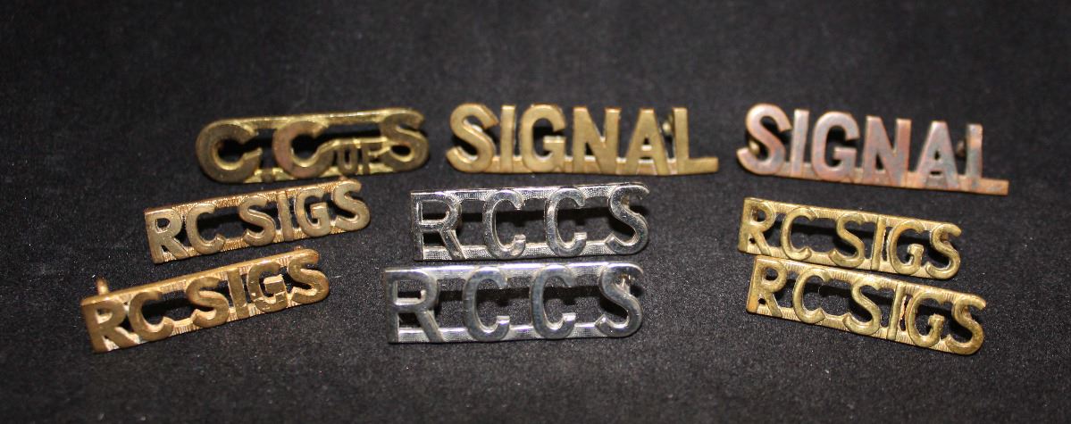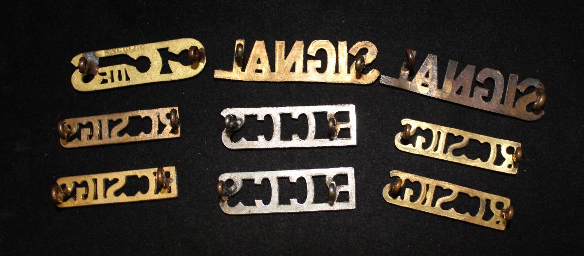1 - C.C.of S, 2 bar, brass metal, 12.87mm high, lug fasteners, SCULLY made. 2 - SIGNAL, joined at bottom, 13.20mm high, lug fasteners, one showing staining, looks like has been in fore or buried. 2 - R C C S, 2 bra, chrome plated, 12.81mm high, lug fasteners. 4 - RC SIGS, 2 bar, 10.27mm high, one pair brass metal other pair dull gold plated metal, lug fasteners. Lot of 9.