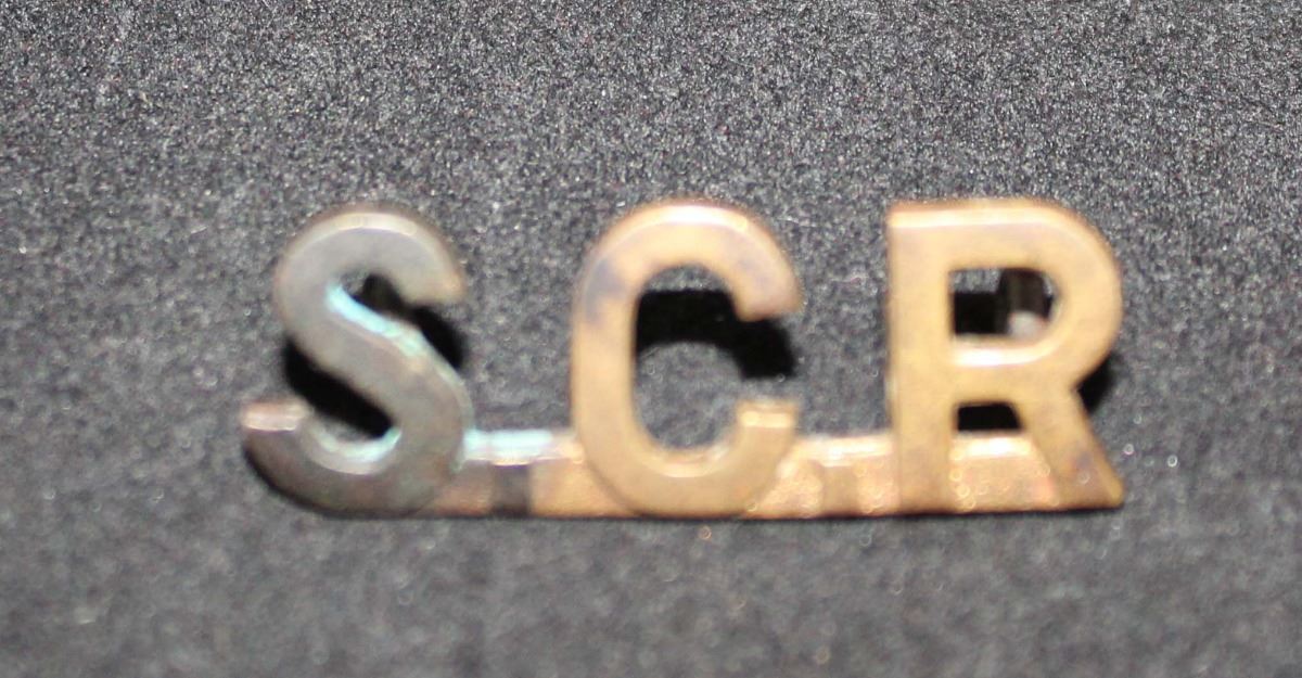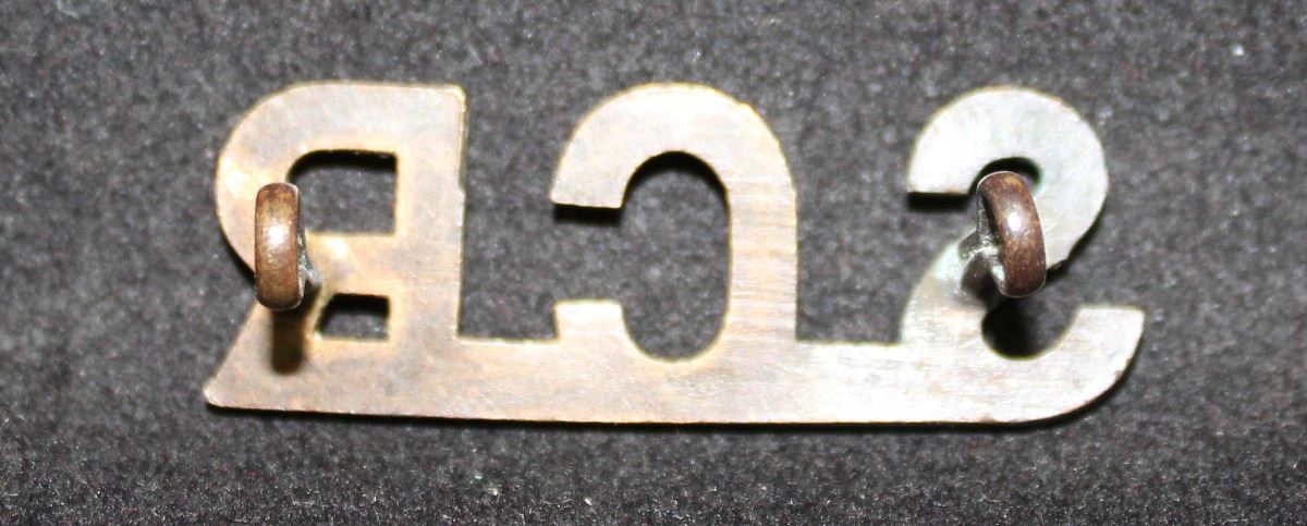 Brass title, S C R, joined at bottom, 13.73mm size. Not sure what this stands for. The vendor feels, Signal Corps Radio. It was shown on the British Badge Forum a couple years ago and nobody could id.it. Some thought maybe Railway. Has the Canadian style rounded lugs. Darking on the S but should clean up. Again not sure.