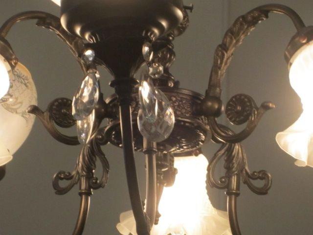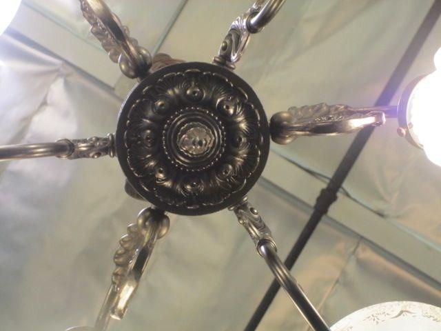 With glass shades. In good condition. Measures 19" tall x 27" diameter. Estimate $200 - $300