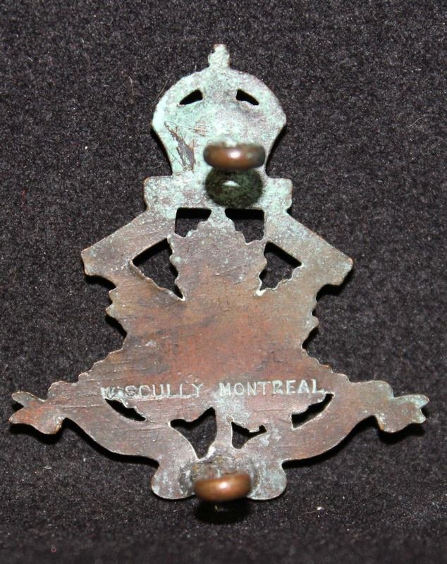 Brass metal. This issue badge have the Cap and Collars both the same size. From the listing in Mazeas looks like the collar badge with the small Maple leaf. SCULLY maker marked, smooth back. Mazeas C20. 1903 issue.