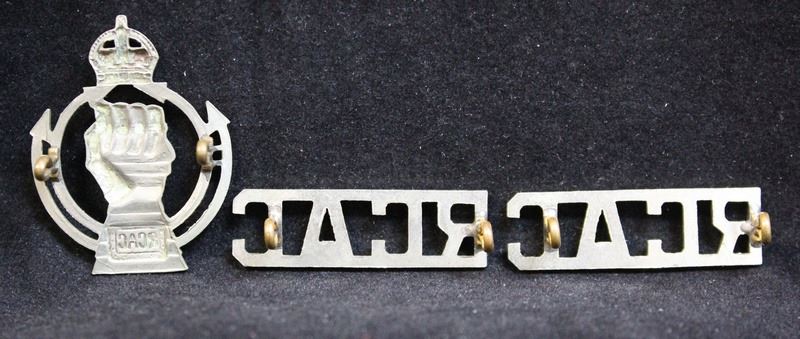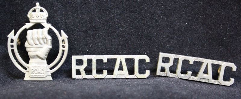 1 - White metal, Mailed Fist design, lug fasteners, RCAC banner, Cap badge. 2 - Pair, R C A C, shoulder title, white metal, 2 bar, 11.91mm high, lug fasteners. Mazeas S30.